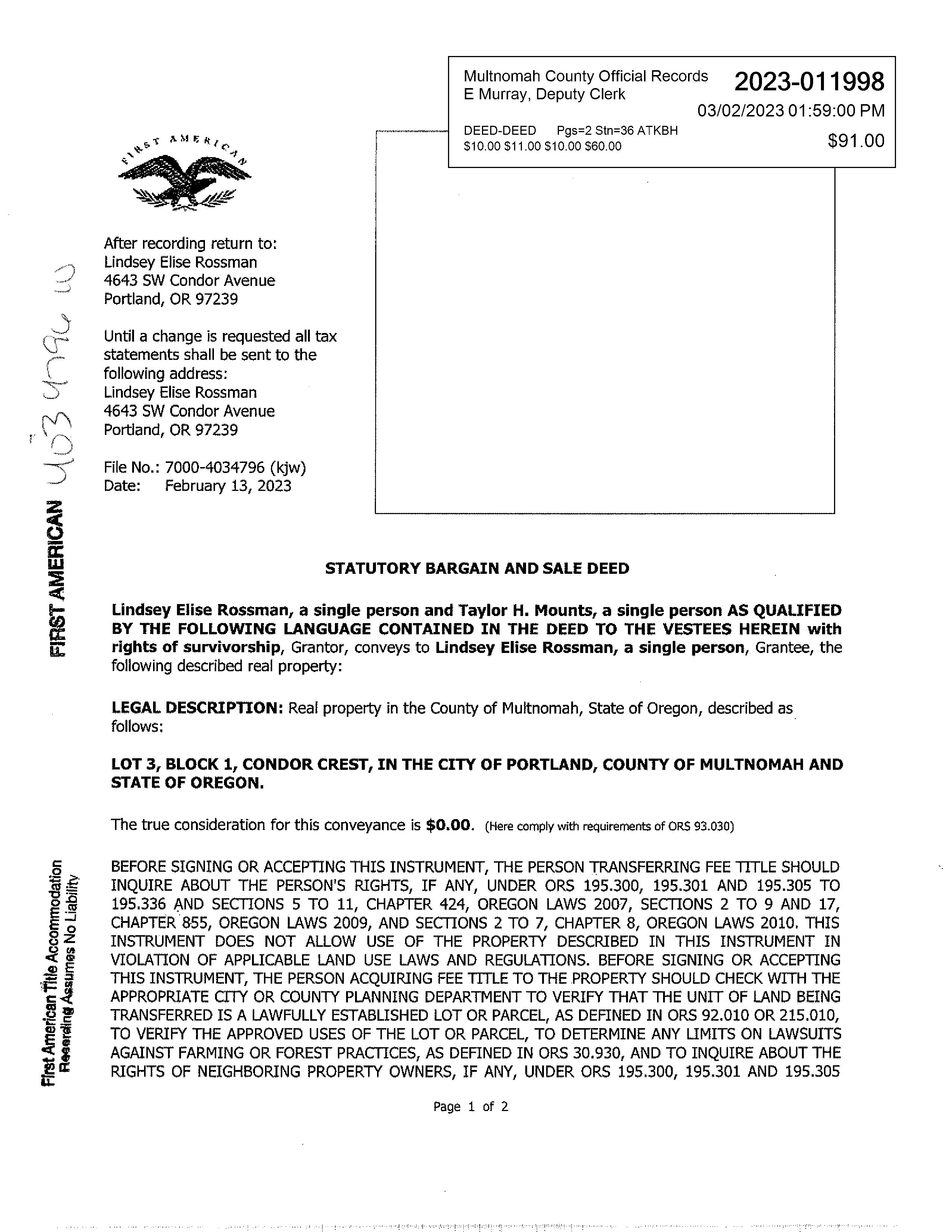 Owner:Rossman,LindseyE 4643SWCondorAve PortlandOR97239-4010