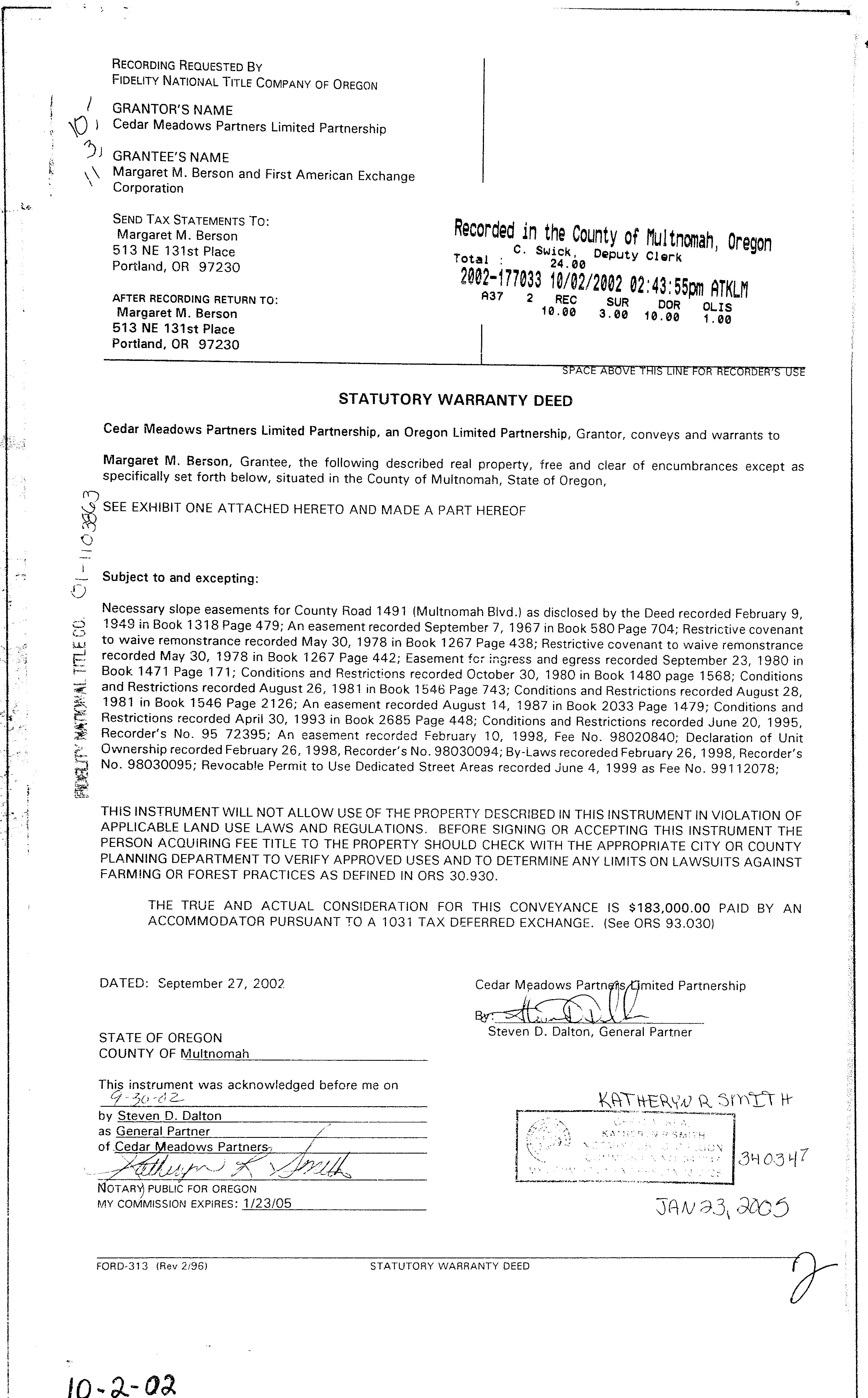 Rec. Date:10/02/2002 Sale Price:$183,000.00 Doc Num:177033
