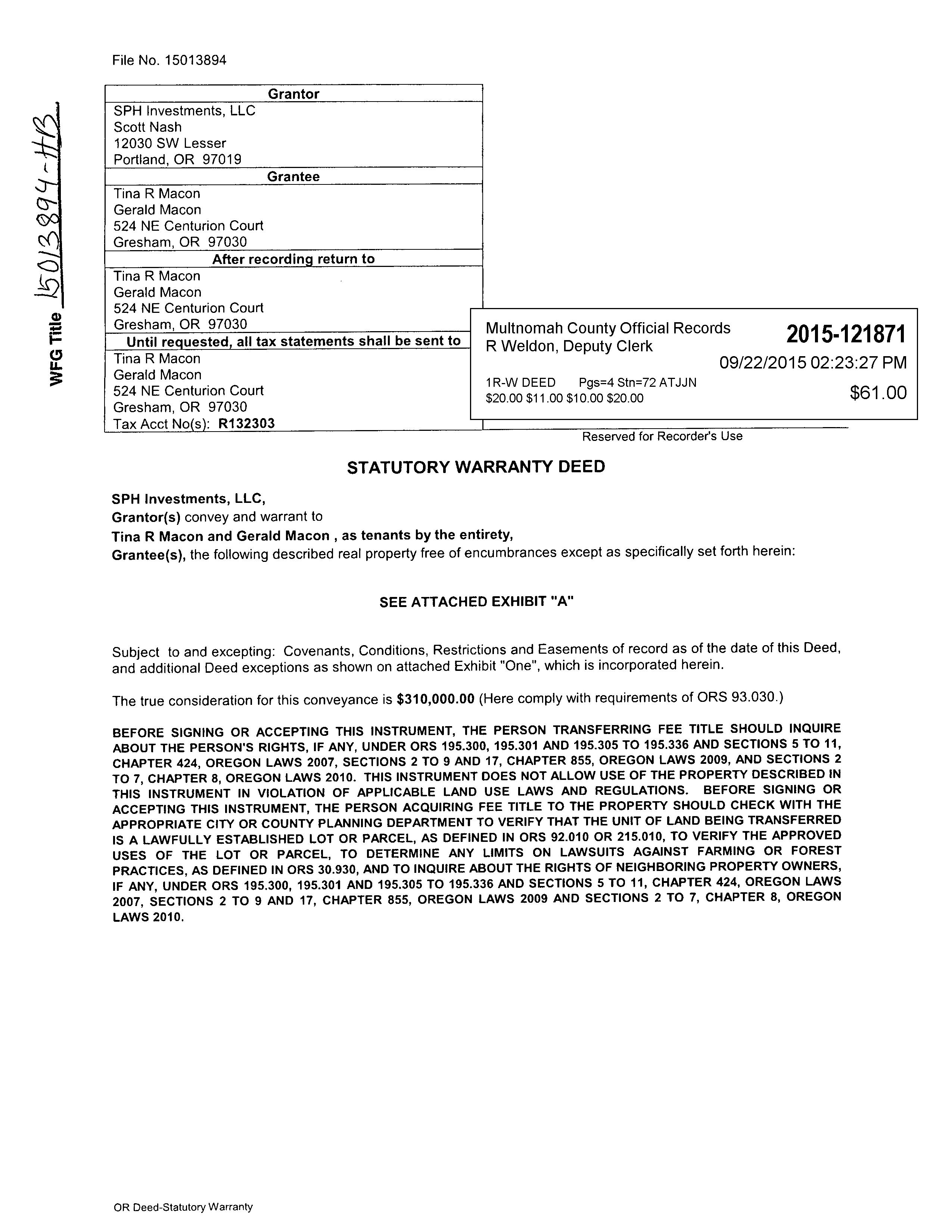 WD SPHINVESTMENTSLLC MACON,TINAR&MACON,GERALD 2015121871 9/21/2015 $310,000