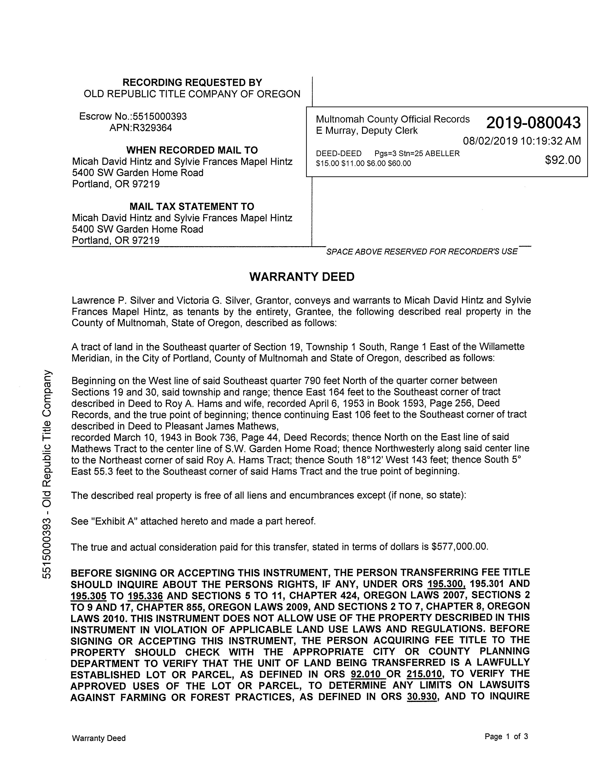 Owner:Hintz, Micah D Hintz, Sylvie Frances M 5400 SW Garden Home Rd