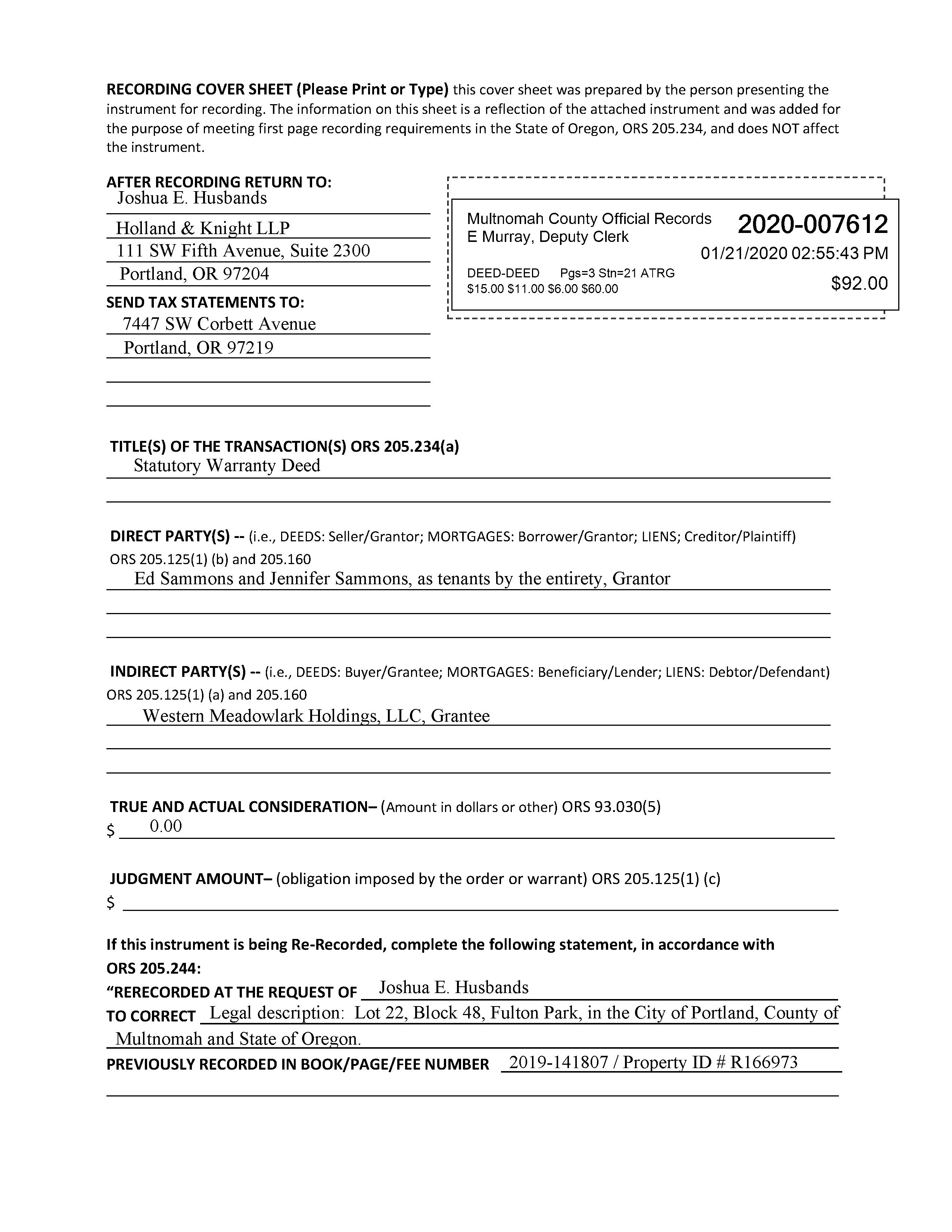 WD SAMMONS,ED&SAMMONS,JENNIFER WESTERNMEADOWLARKHOLDINGS LLC 2020007612 1/21/2020 -