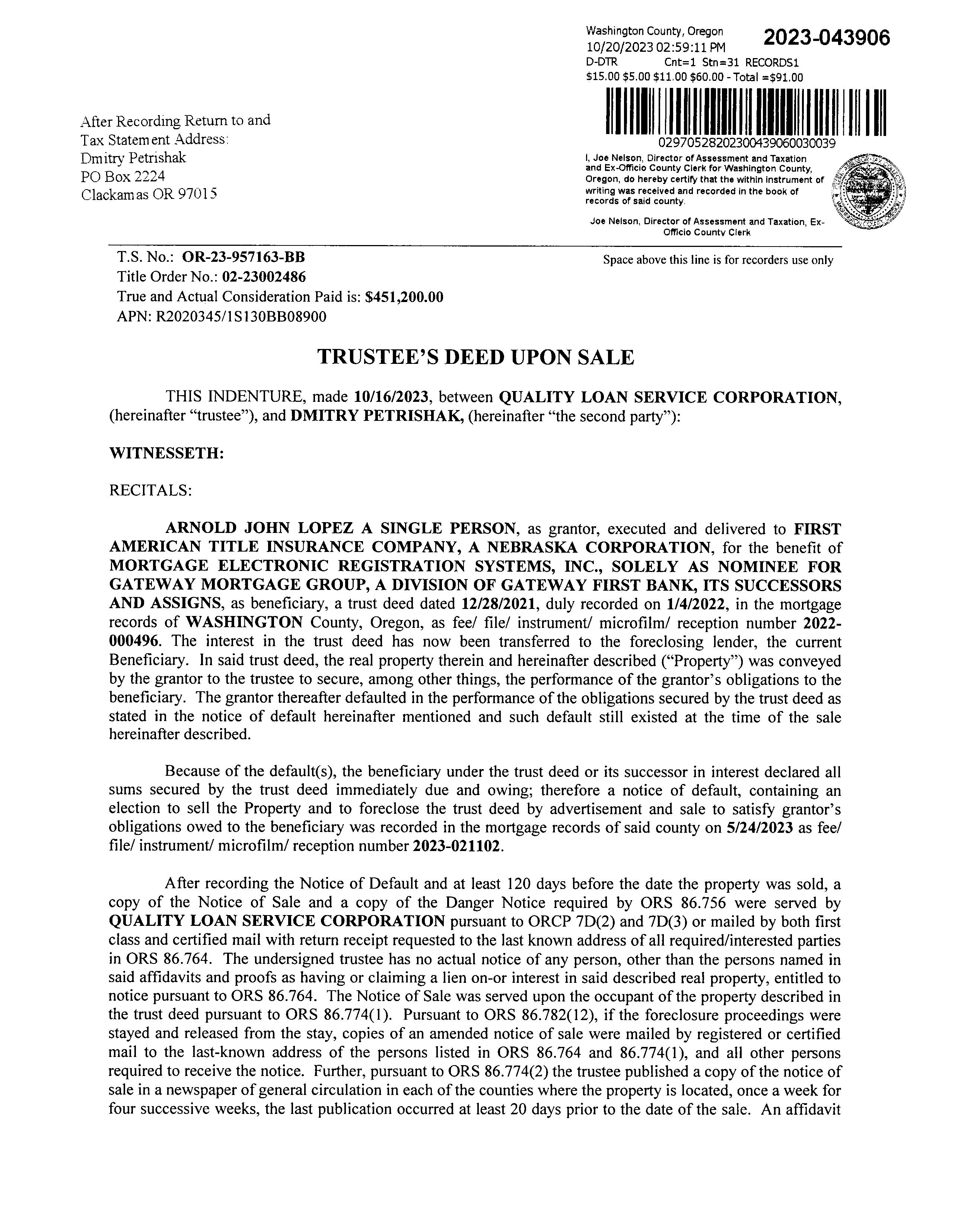 E ective Date: SALES HISTORY SALE DATE SELLER BUYER INST # SALE PRICE INST TYPE LOPEZ, ARNOLD JOHN PETRISHAK, DMITRY 2023043906 - DTR LOPEZ, HOPE M & LOPEZ, ARNOLD J LOPEZ, ARNOLD JOHN 2016072783 - DBS 10/15/2008 PRUDENTIAL RELOCATION INC LOPEZ, HOPE M & LOPEZ, ARNOLD J 2009074262 $290,000 DW 5/20/1993 L A DEVELOPMENT CO ASHFORD HOMES INC 1993040533 $405,000 DW 8/12/2008 STANCLIFF, BRIAN K & BARBARA PRUDENTIAL RELOCATION INC 2008089501 $360,000 DW 5/1/2006 GAREZ, JEROME & CANDIDE STANCLIFF, BRIAN K & BARBARA 2006066289 $395,000 DW 2/20/2004 AGRANOFF, BRIAN K & MAIA G GAREZ, JEROME & CANDIDE 2004018026 $281,818 DW 4/25/1997 DUCHAINE, LINDA M AGRANOFF, BRIAN K & MAIA G 1997040163 $225,500 DW 4/26/1995 ASHFORD HOMES INC DUCHAINE, LINDA M 1995029846 $194,954 DW TOTAL TAXES DUE Current Year Due $0.00 Past Years Due $0.00 Total Due $0.00