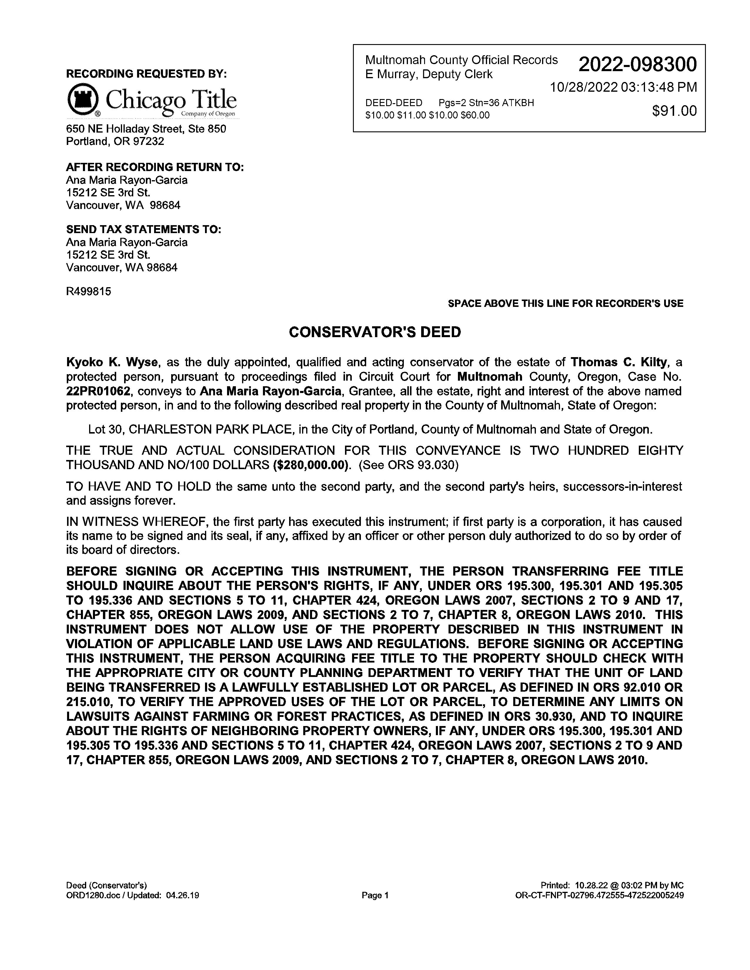 CONS KILTY,THOMASC RAYON-GARCIA,ANAM 2022098300 10/28/2022 $280,000 ARPPP KILTY,THOMASC KILTY,THOMASC 2022070620 7/20/2022 -