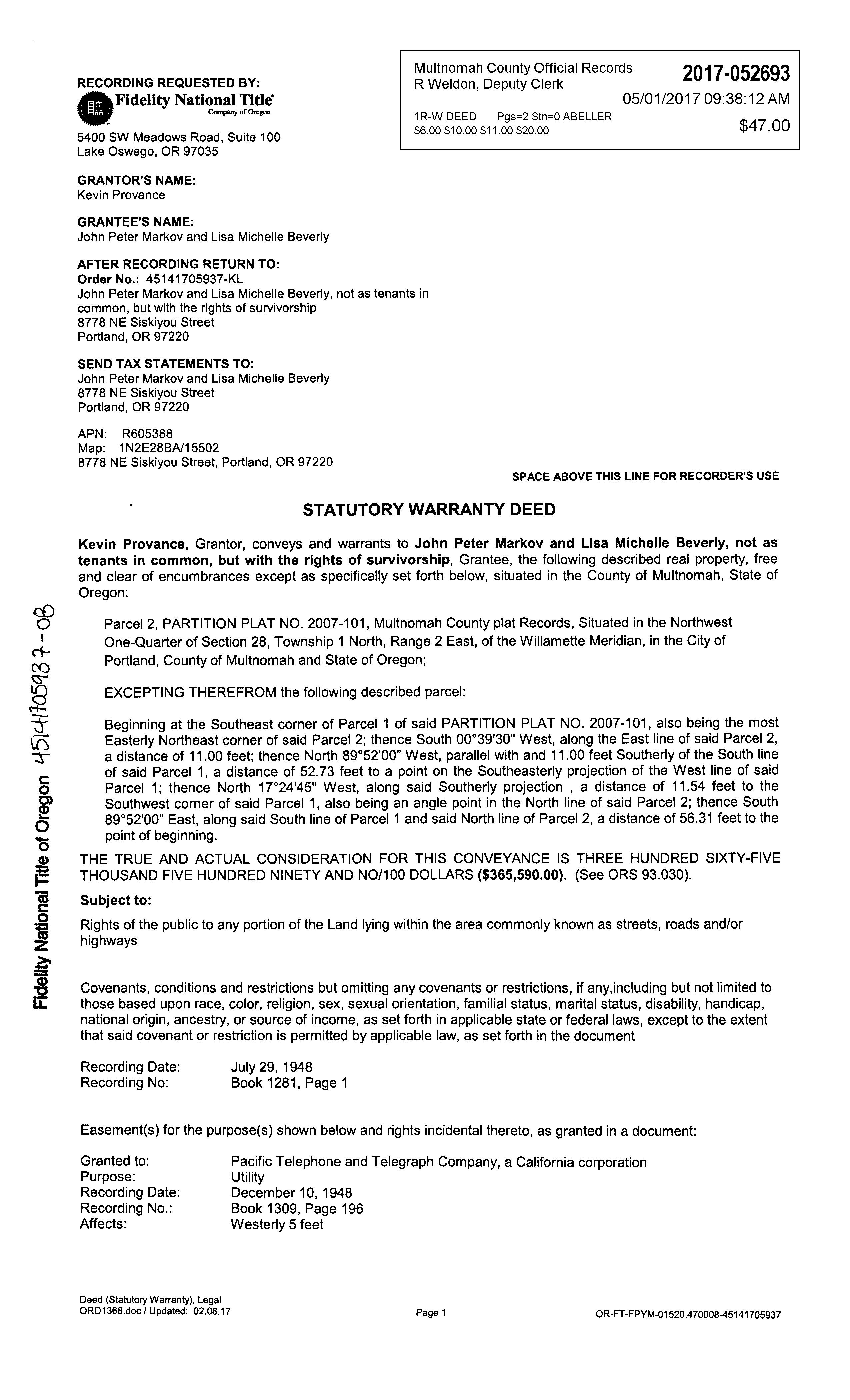 Rec Date:05/01/2017 Sale Price:$365,590 00 Doc Num:52693