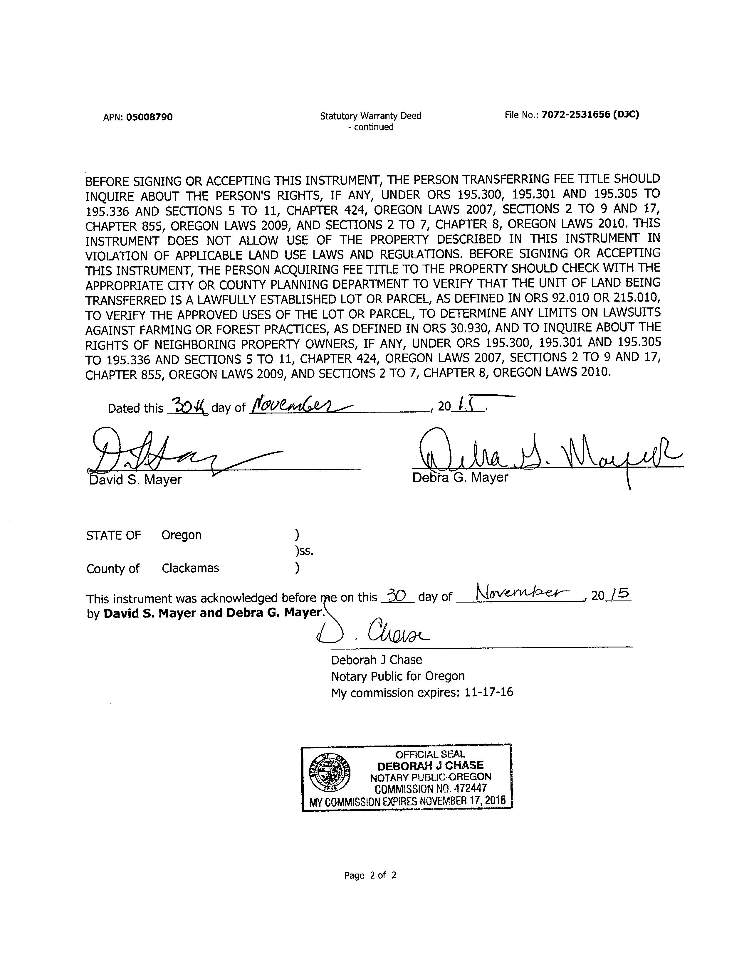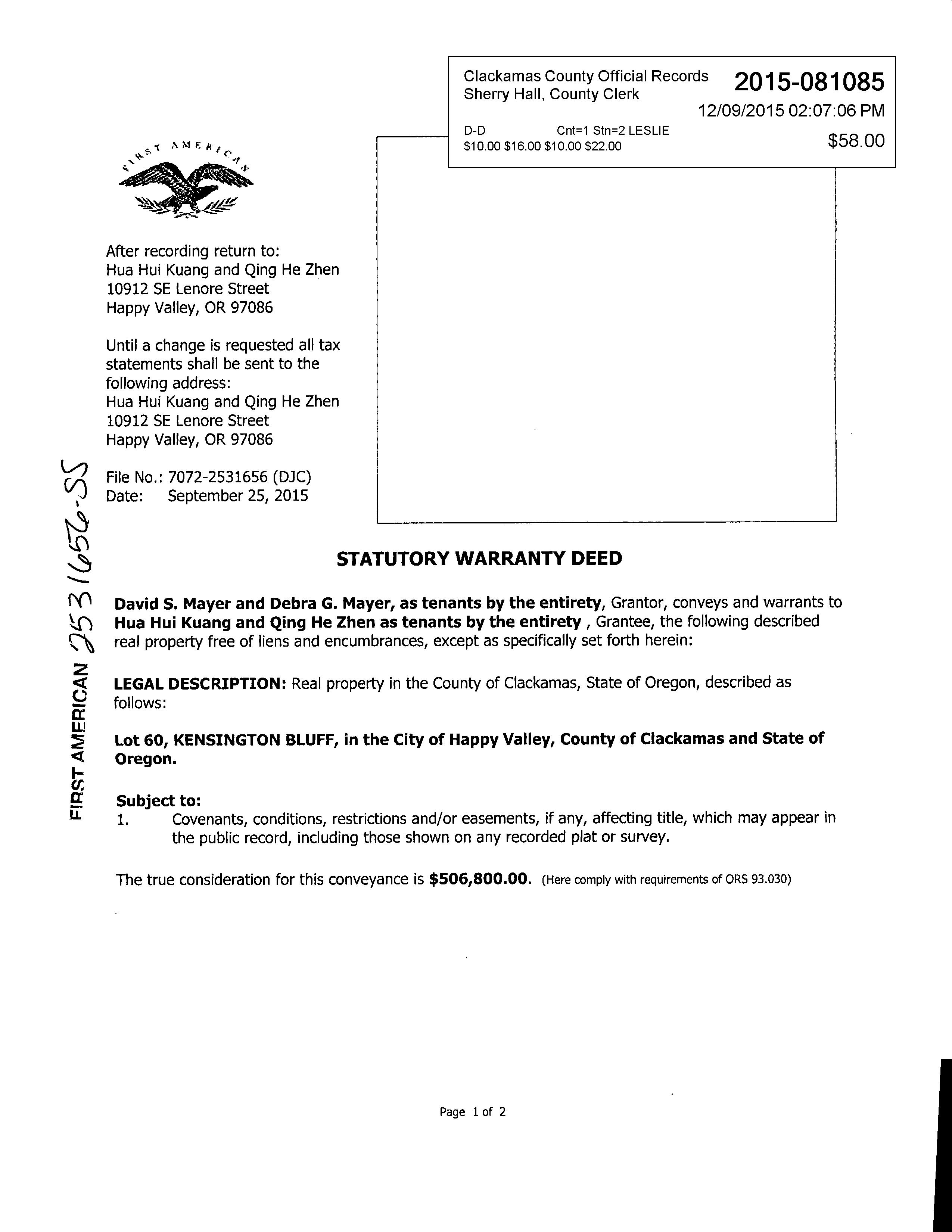 History SaleDate EntryDate Recording Date Recording Number SaleAmount Excise Number Deed Type Transfer Type Grantor(Seller) Grantee(Buyer) Other Parcels 11/30/2015 01/27/2016 12/09/2015 2015081085 $506,800.00 289908 S MAYER DAVID S & DEBRA G KUANG HUA HUI & QING HE ZHEN No 06/15/2005 10/13/2005 09/30/2005 2005097088 $505,730.00 128385 S D R HORTON INCPORTLAND MAYER DAVID S & DEBRA G No 03/17/2005 03/28/2005 03/21/2005 2005024264 $5,901,397.00 115125 X OAKRIDGE ESTATES DEV CORP D R HORTON INCPORTLAND No PropertyDetails LivingAreaSqFt ManfStructSize YearBuilt ImprovementGrade Stories Bedrooms FullBaths HalfBaths 3707 0 X 0 2005 52 2.0 5 3 1