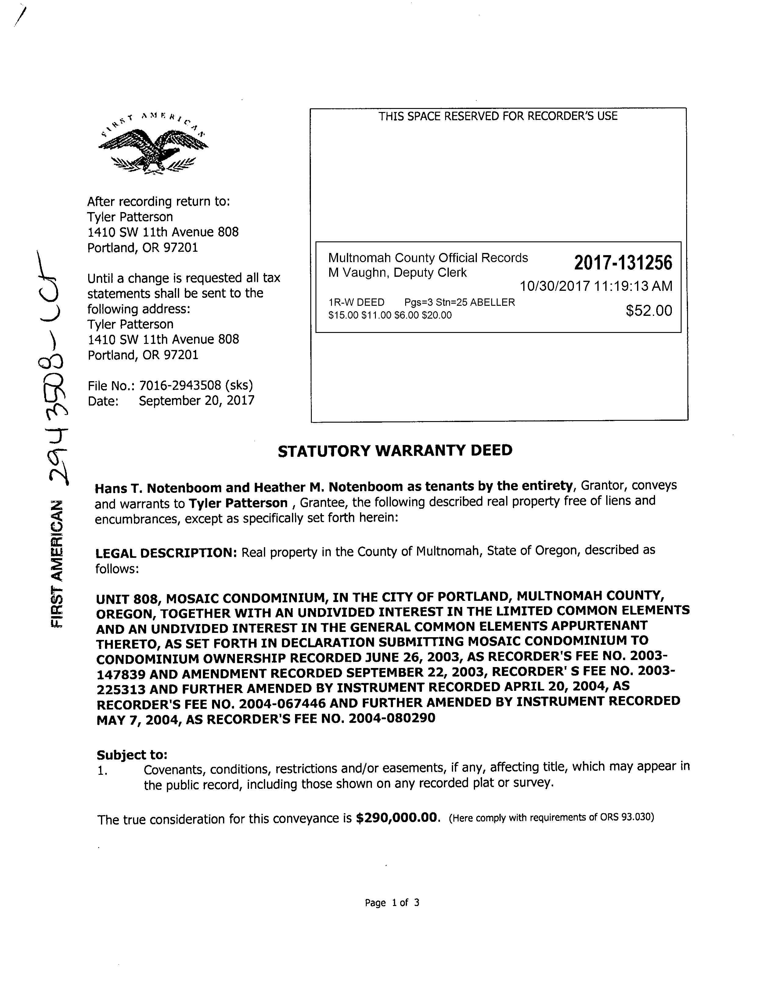 PropertiesSplit / Merge DateSplit / Merge AccountsSplit / Merge MessageIMPROVEMENTS ? Expand/Collapse All ASSESSEDVALUES YEAR IMPROVEMENTS LAND SPECIALMARKET/USE RMV M5VALUE EXEMPTIONS M50ASSESSED 2022 $271,200 - - / - $271,200 $271,200 $220,390 2021 $277,800 - - / - $277,800 $277,800 $213,980 2020 $278,330 - - / - $278,330 $278,330 $207,750 2019 $294,360 - - / - $294,360 $294,360 $201,700 2018 $301,240 - - / - $301,240 $301,240 $195,830 2017 $298,620 $0 $0 / $0 $298,620 $298,620 $190,130 2016 $263,510 $0 - / $0 $263,510 $263,510 $184,600 2015 $243,810 $0 $0 / $0 $243,810 $243,810 $179,230 2014 $220,260 $0 $0 / $0 $220,260 $220,260 $174,010 2013 $194,390 $0 $0 / $0 $194,390 $194,390 $168,950 SALESHISTORY DEED SELLER BUYER INSTR# DATE CONSIDERATION AMOUNT WD NOTENBOOM,HANST& NOTENBOOM,HEATHERM PATTERSON,TYLER 2017131256 10/26/2017 $290,000 WD JONES,BLAIRT MOSAICPORTLANDCONDOMINIUMLLC 01140863 9/5/2001WD REVES,EANG NOTENBOOM,HANST& NOTENBOOM,HEATHERM 2015108144 8/20/2015 $247,500 WD MOSAICPORTLANDCONDOMINIUMLLC REVES,EANG 2004129060 8/11/2003 $195,000 ? Improvement #1 Improvement Type Building Type Class - CONDOMINIUM,RESIDENTIAL 2ORMORESTY 4N