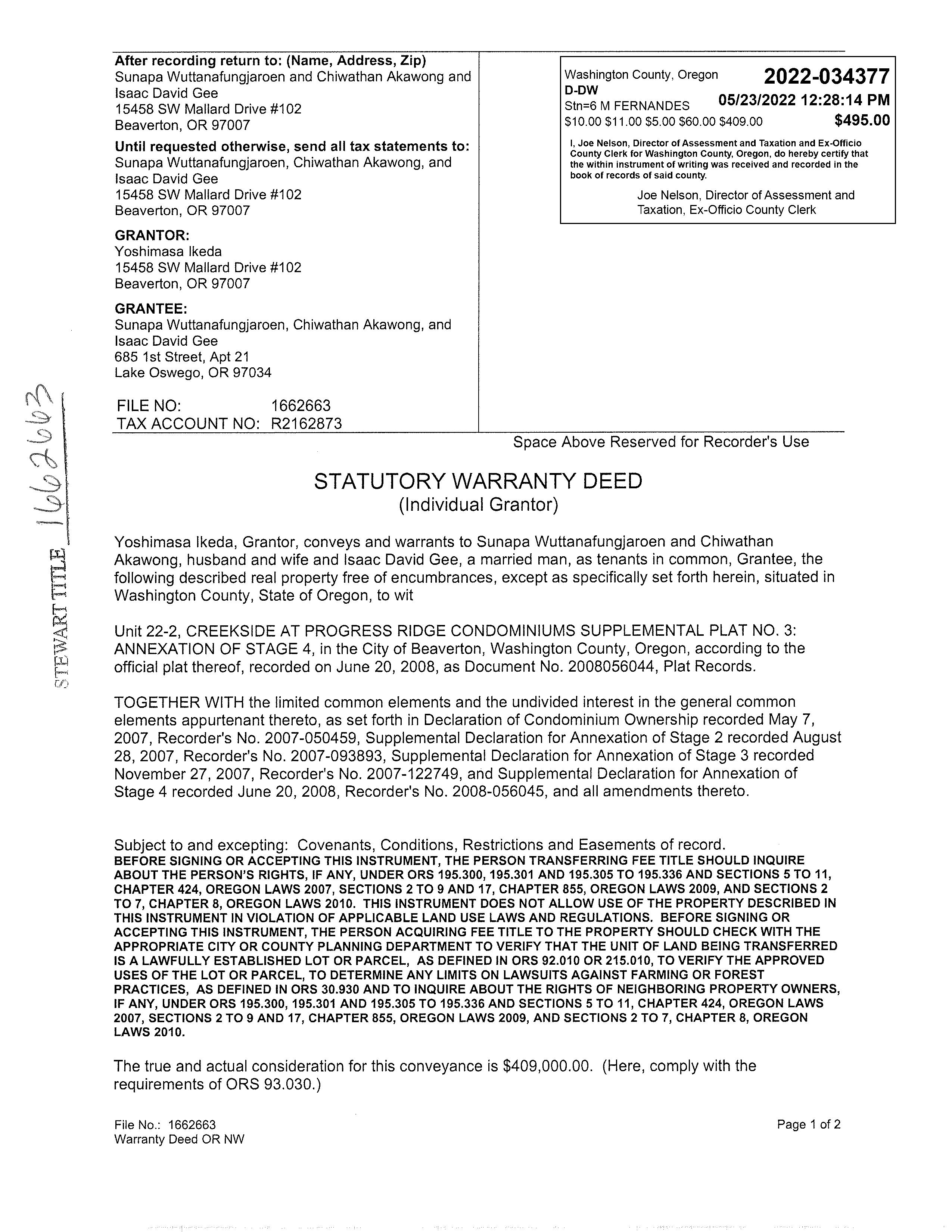 Site Address: 15458 SW Mallard Dr, Unit #102, Beaverton OR 97007