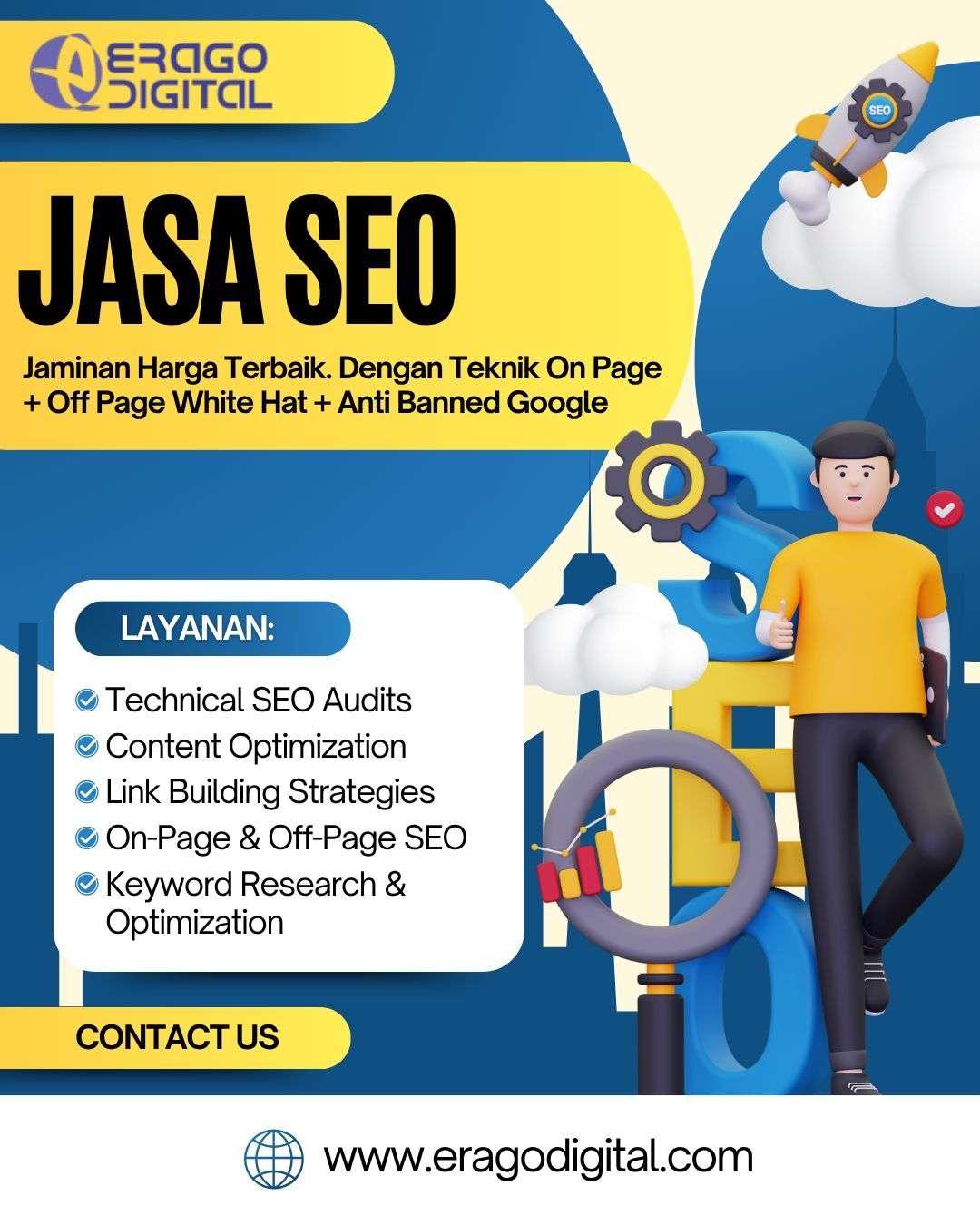 Sebagai perusahaan jasa SEO terpercaya, PT Erago Digital telah menangani berbagai proyek dari UKM hingga korporasi nasional. Kami memiliki tim ahli SEO yang siap membantu Anda mulai dari tahap audit, riset kata kunci, strategi konten, hingga optimasi teknikal dan backlink. Setiap strategi disesuaikan dengan industri dan target pasar Anda. Kami berkomitmen memberikan layanan yang berorientasi pada hasil dan pertumbuhan jangka panjang. Hubungi kami di 081222555757 dan jadikan PT Erago Digital sebagai mitra SEO andalan Anda.