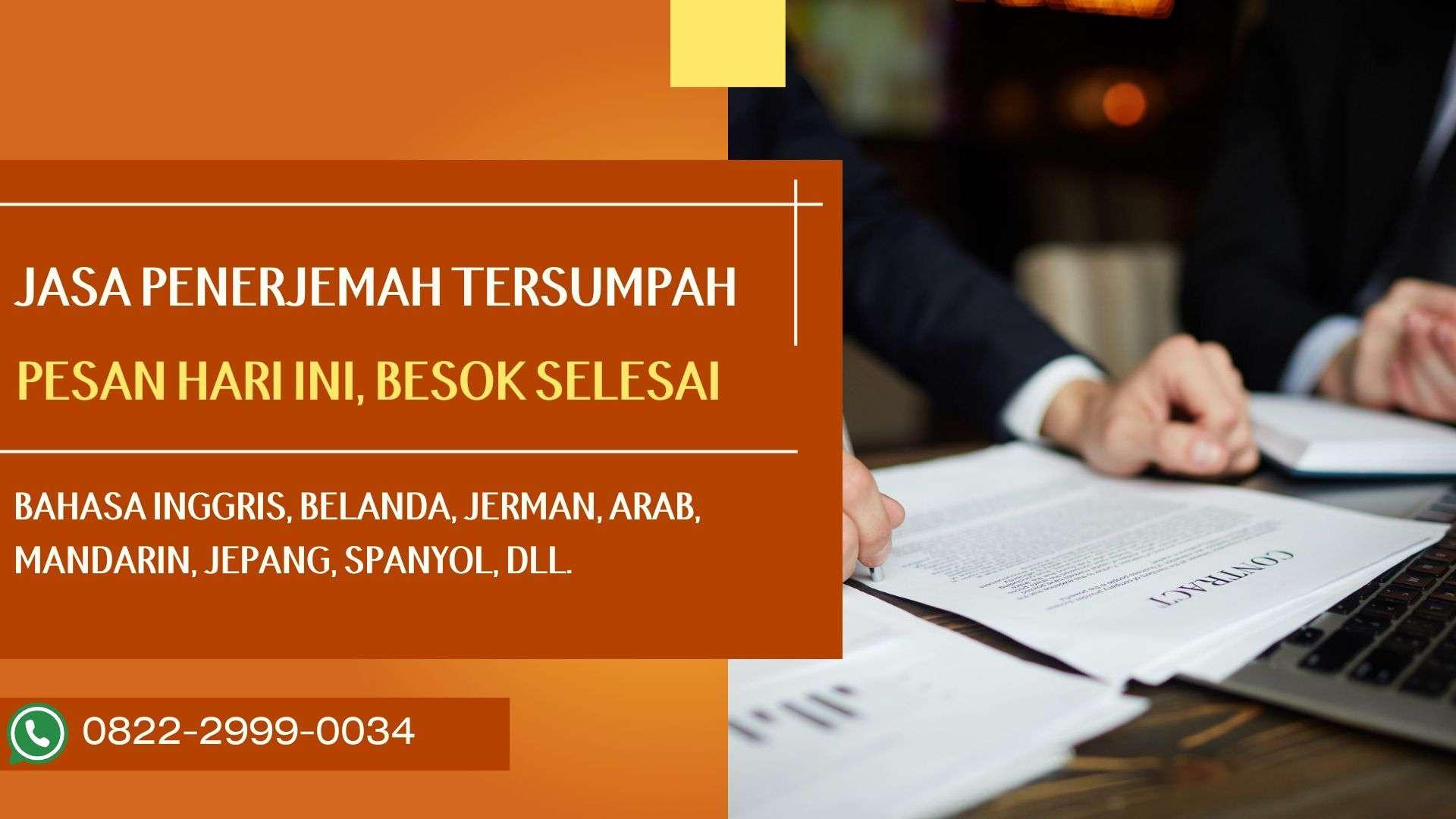 Perusahaan kami menyediakan layanan penerjemah tersumpah di Surakarta yang diakui secara resmi. Dengan tenaga bersertifikasi dan berpengalaman, kami mampu menerjemahkan dokumen seperti ijazah, surat nikah, akta, dan dokumen legal lainnya secara akurat dan cepat. Kami menjaga kerahasiaan dan keaslian dokumen klien. Hubungi kami melalui WhatsApp di 0822-2999-0034 untuk layanan penerjemahan tersumpah yang profesional dan terpercaya di Surakarta.