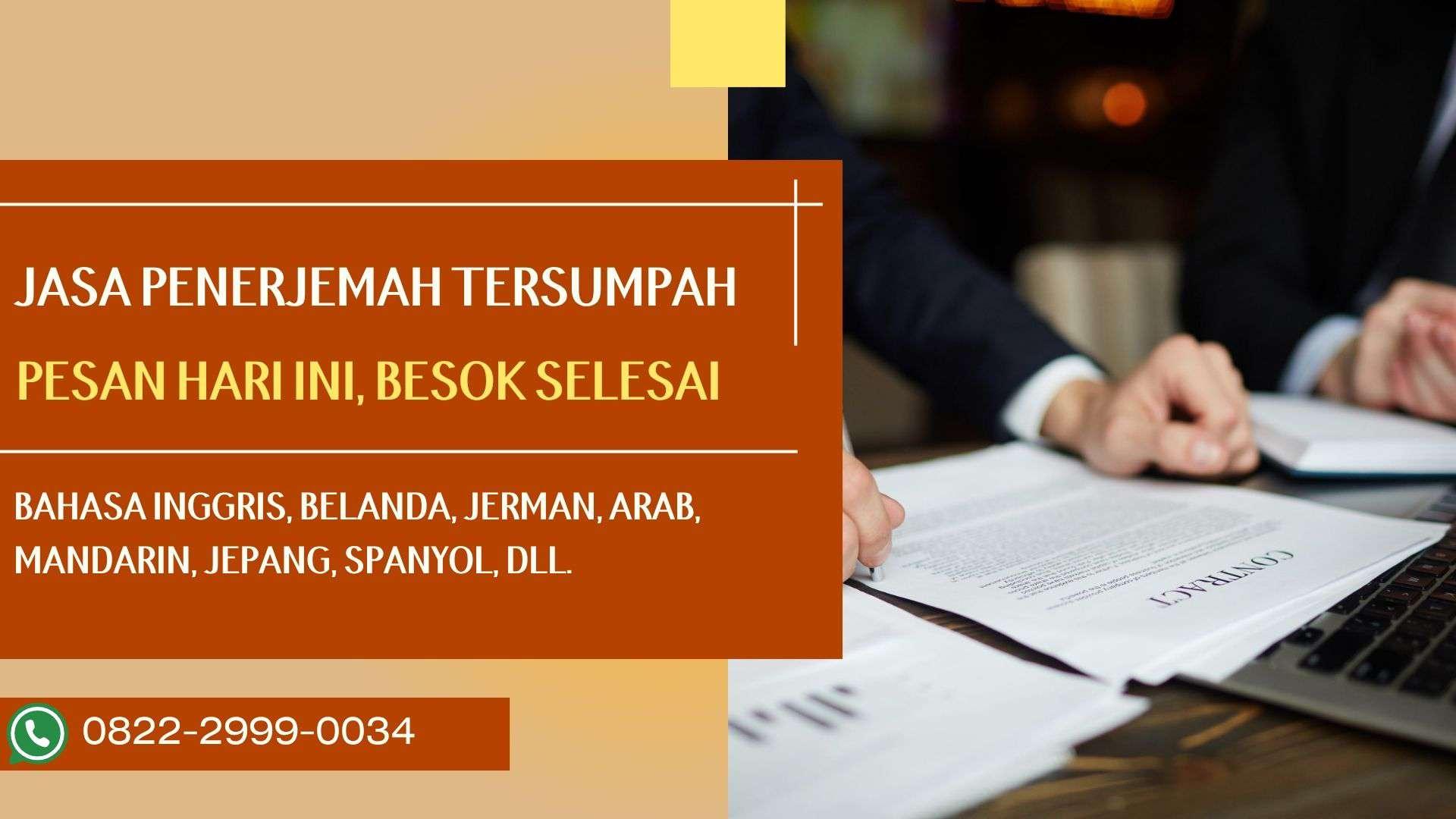 Dalam memenuhi kebutuhan penerjemahan dokumen resmi di Banjarnegara, perusahaan kami hadir sebagai solusi utama. Kami menawarkan layanan penerjemah tersumpah yang diakui secara hukum dan memiliki pengalaman luas dalam menerjemahkan dokumen legal, akademik, dan bisnis. Tim kami terdiri dari penerjemah bersertifikasi yang berkomitmen memberikan hasil yang akurat dan cepat. Kami mengutamakan kerahasiaan dan profesionalisme dalam setiap pekerjaan. Jika Anda membutuhkan jasa penerjemah tersumpah di Banjarnegara, perusahaan kami siap membantu. Hubungi kami melalui WhatsApp di 0822-2999-0034 untuk informasi lebih lanjut dan layanan terbaik.