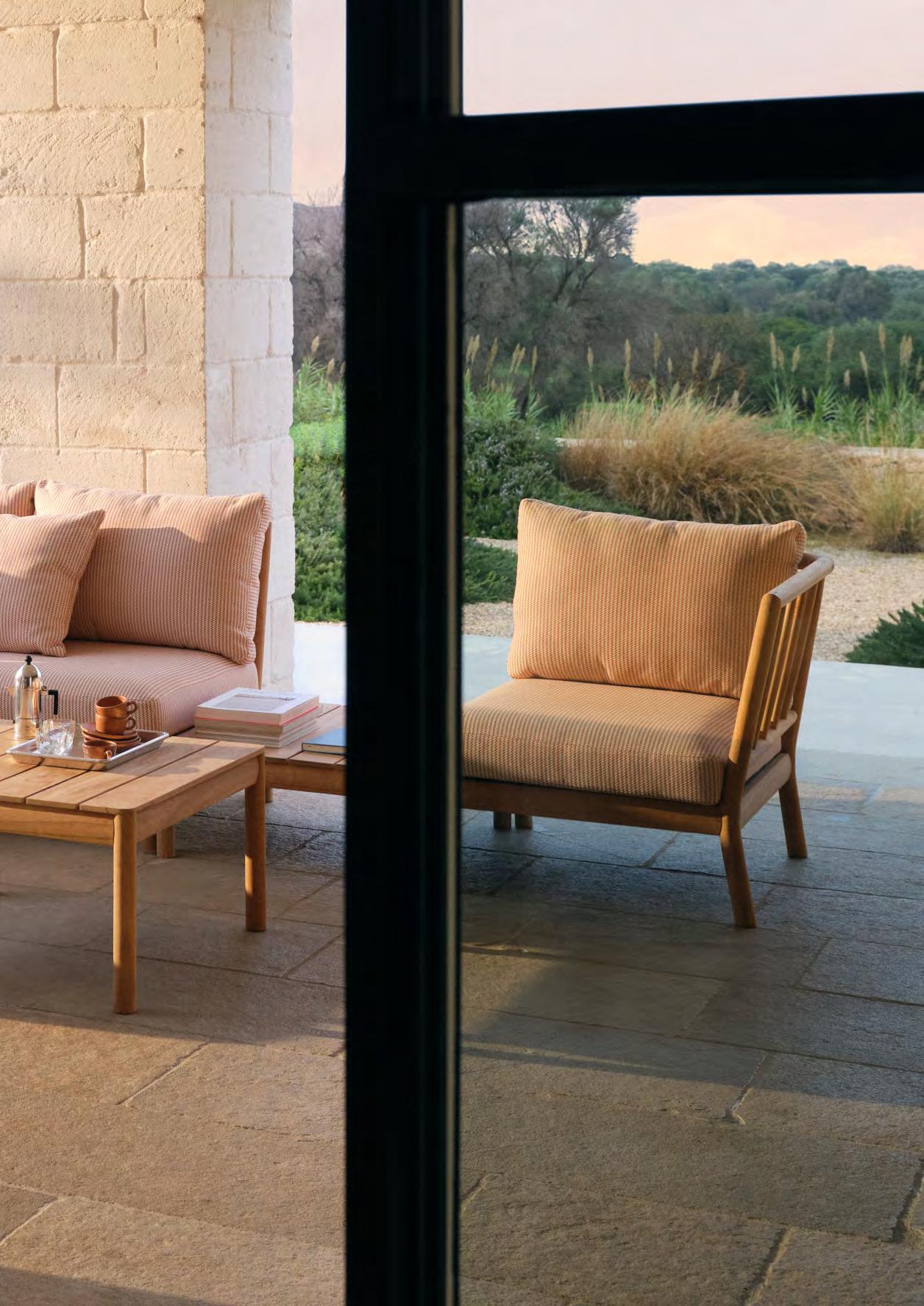 Tradition is a modular outdoor lounge series defined by its spindle-back frame and generous comfort. Crafted from FSC™-certified core teak and paired with soft, weather-resistant cushions, the series brings together precision woodcraft, naturally oil-rich teak, and textiles designed for lasting outdoor enjoyment.