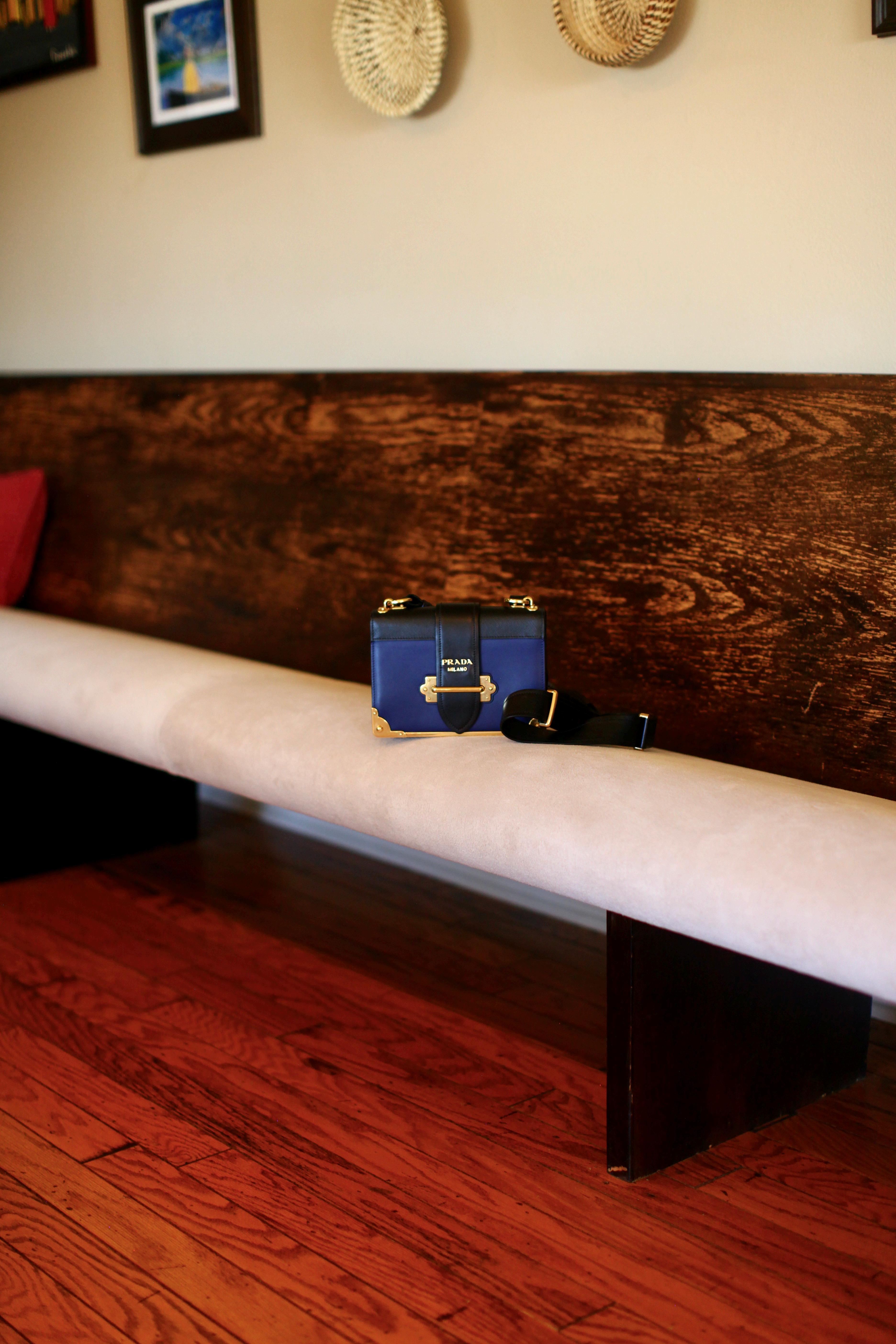 Inspired by antique books and vintage trunks, this bag is equal parts storybook charm and modern glamour. In a striking ink-blue hue, it’s decked out with burnished gold hardware, protective corners, a chic front logo plaque, and metallic accents that make it shine. This bag is gently used, but in pristine shape and comes with a dust bag.