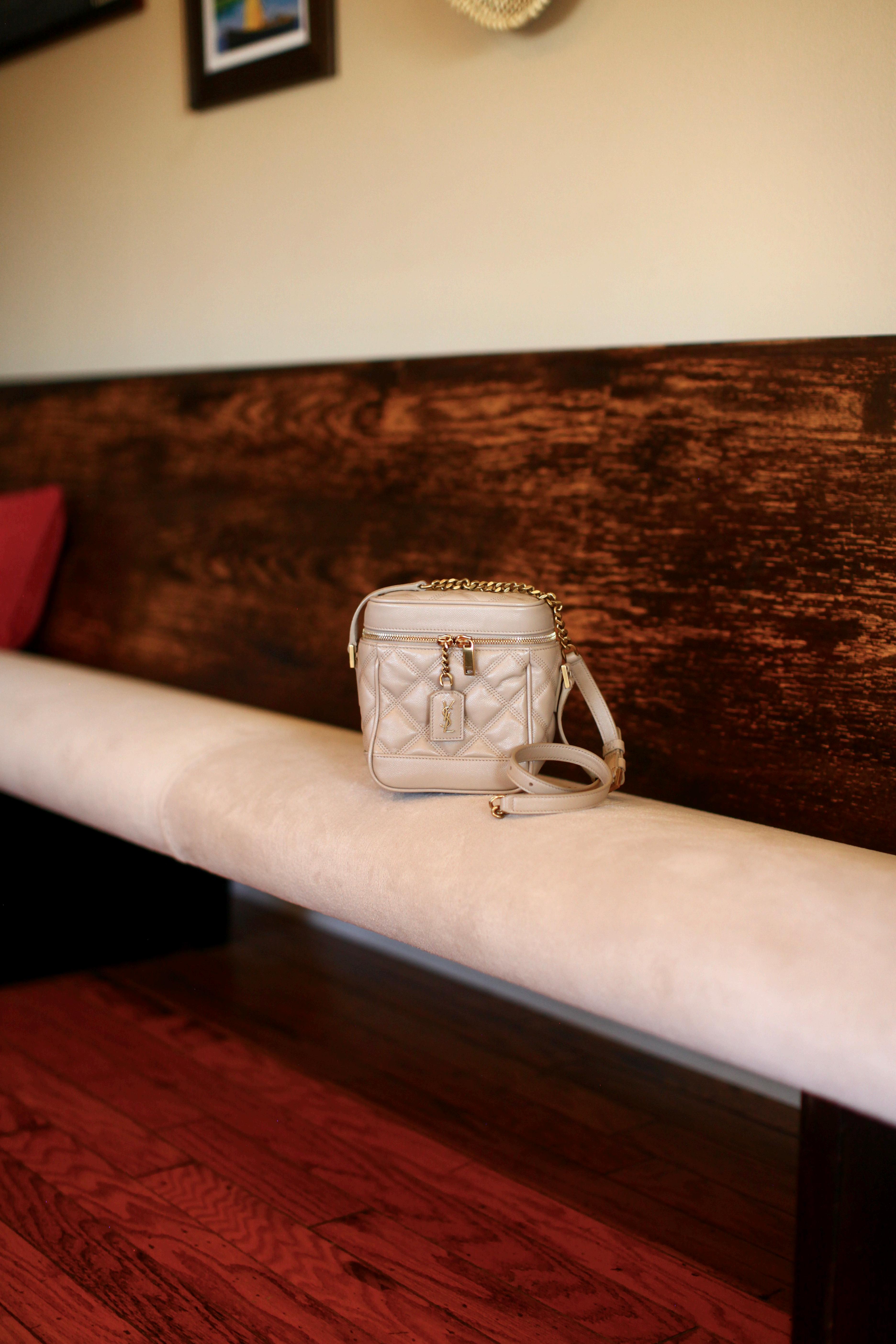 This authentic vanity bag from YSL brings serious 80’sinspired elegance with its classic black Grain de Poudre leather and chic diamond quilting. It features a gorgeous aged gold chain-and-leather shoulder strap with matching hardware for that perfectly polished, slightly vintage vibe. A true classic that adds instant sophistication to any outfit! This bag is gently used, but in pristine shape and comes with a dust bag.