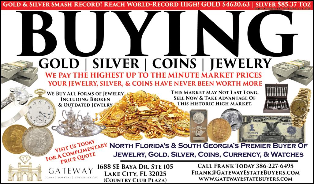 Serving Lake City for 10 yrs! Top dollar paid for gold and silver jewelry, sterling silverware, diamonds, and coins, directly across from Toyota on 90. 386-965-3470. (C 12/30/26)