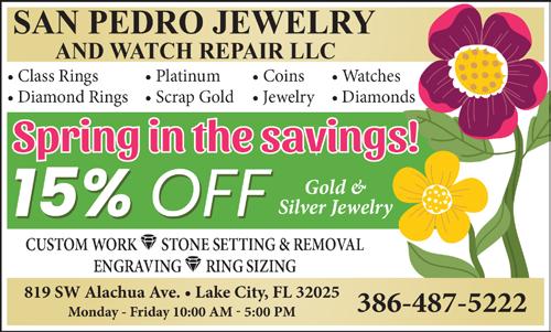 Stoneland Reclining Living Room SOFA RETAIL $1229 NOW $869 LOVE RETAIL $1179 NOW $829 2 COLORS AVAILABLE MARKENBURG KING BEDROOM ROKANE 7 PC DINING PALM BLISS OUTDOOR SET REALYN TV STAND CLOVERBROOK PATIO SET PANTOMINE SECTIONAL VELVETEEN SETTEE RETAILER IN NORTH AMERICA # 1 5 PC RETAIL $5319 NOW $3459 SET RETAIL $999 NOW $699 RETAIL $739 NOW $369 5 PC RETAIL $3999 NOW $2899 5 PC RETAIL $1109 NOW $649 4 PC RETAIL $2269 NOW $1359 RETAIL $869 NOW $599 MORRELL’S LAKE CITY SW Deputy J. Davis Lane 386.752.3910 MATTRESS EXPERTS LAKE CITY 3525 NW Bascom Norris Dr. 386.319.8016 50% save up to 50% OFF 567 SW Main Blvd. Lake City 386.752.1901 For National Donut Day! June 2ND Donuts (386) 752-8660 Start Your Auto, Boat or RV QUOTE NOW! Then finish with a licensed local agent. “Always fast and friendly service, very thorough and professional.” —Smith, J. PREMIER ROOFING COMPANY • AFFORDABLE FINANCING NEW METAL ROOF • METAL ROOF OVER • METAL ROOF REPAIR • SHINGLE ROOF REPAIR Florida Licensed Roofing Contractor - LIC# CCC-1331527 (386) 209-0850 When Quality Matters, Call The Masters! FloridaRoofMastersLLC.com FREE ESTIMATES! EXCAVATOR WORK Land clearing and excavation work. Licensed & Insured. Call for free estimates. (386)249-5734 WE BUY JUNK CARS HIGHEST PAID CASH! Free Pickup 7 Days a week. YOU CALL, WE’LL HAUL! 386-867-0891