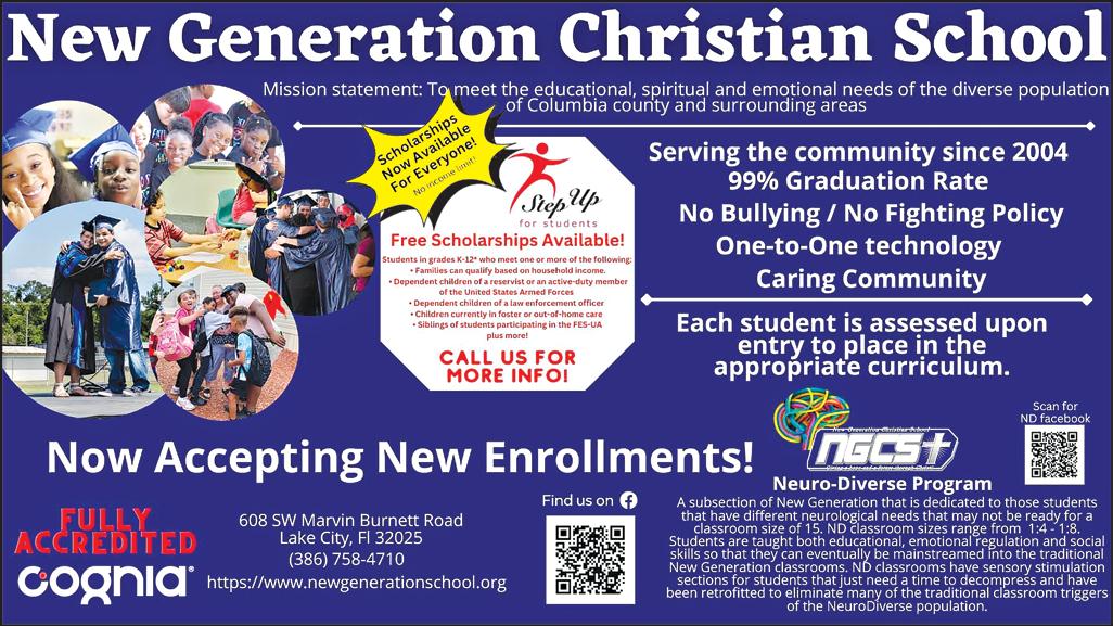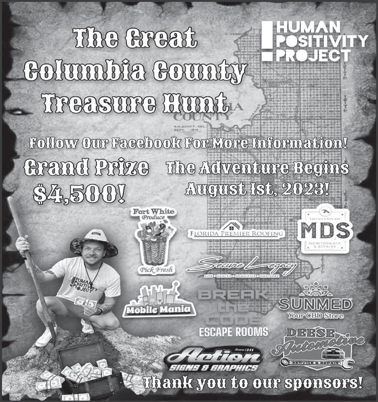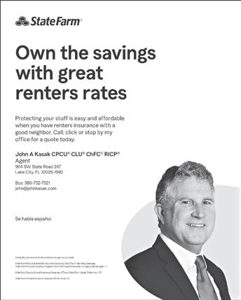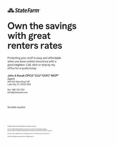 SERVING NORTH CENTRAL FLORIDA 65 YEARS 358 NW Main Blvd. Lake City, FL 32055 230561 LAKE CITY MSFC 6/7/23 Hungry Howie’s and its related marks are trademarks of Hungry Howie’s Pizza & Subs, Inc. Use of the trademarks in the State of Florida are under license of HH Pizza, Inc. All Hungry Howie’s stores are independently owned and operated. Prices and partici pation may vary. LARGE 1 TOPPING PIZZA & 3 CHEESER BREAD $1499 USE CODE: PZ11 Price and participation may vary by location. Carry-out only. Premium toppings extra. Expires in 30 Days. Price and participation may vary by location, as well as minimum delivery orders & fees. Premium toppings extra Expires in 30 Days. Large Cheese or Pepperoni Pizza Large Oven Baked Sub Large Baked Pasta Regular Salad 17D01 17A01 17B01 17C01 CHOOSE YOUR FAVORITE! $799 CARRY OUT EACH $899 ONLY EACH NEW! FLATBREAD PIZZA Price and participation may vary by location, as well as minimum delivery orders & fees. Premium toppings extra. Expires in 30 Days. FEEDS 1-2 PEOPLE Our Chicken Flatbread Pizza is hot, thin and crispy. Available in 4 delicious varieties in no time flat. CHICKEN FLAVOR YOUR CRUST FOR FREE ‘73 CLASSIC $999 LARGE PIZZA WITH 73* SLICES OF CLASSIC CUPPED™ PEPPERONI LIMITED TIME OFFER USE CODE : CLASSIC FEATURED FLAVORED CRUST ™ *Count Approximate. Limited time offer. Price and participation may vary by location. Carry-out only. Premium toppings extra. Expires in 30 Days. CARRYOUT ONLY LAKE BUTLER 720 EAST MAIN STREET NEXT TO BADCOCK FURNITURE (386) 496-2878 DRIVE-THRU • CARRY-OUT FT WHITE 7788 S.W. US HWY 27 NEXT TO SUBWAY (386) 497-1484 DRIVE-THRU • CARRY-OUT LAKE CITY 857 S.W. MAIN BLVD. IN LAKE CITY PLAZA • DELIVERY (386) 755-7050 WE DELIVER! ORDER ONLINE! HUNGRYHOWIES.COM WE DELIVER! WEDNESDAY, AUGUST 9, 2023 ECRWSS PRST. STD U.S. POSTAGE PAID LAKE CITY, FL PERMIT #63 RESIDENTIAL CUSTOMER Volume 65 Issue 32 See ad on page 12 & 13