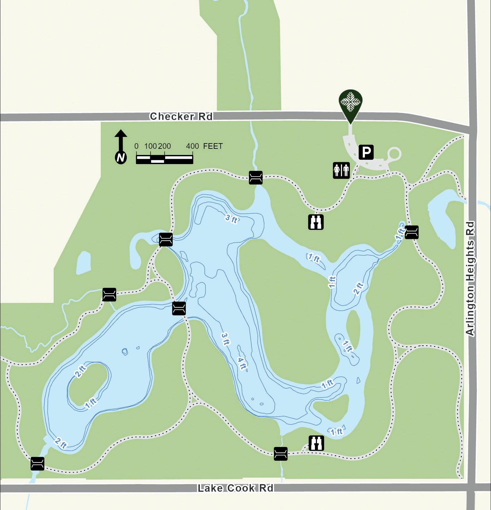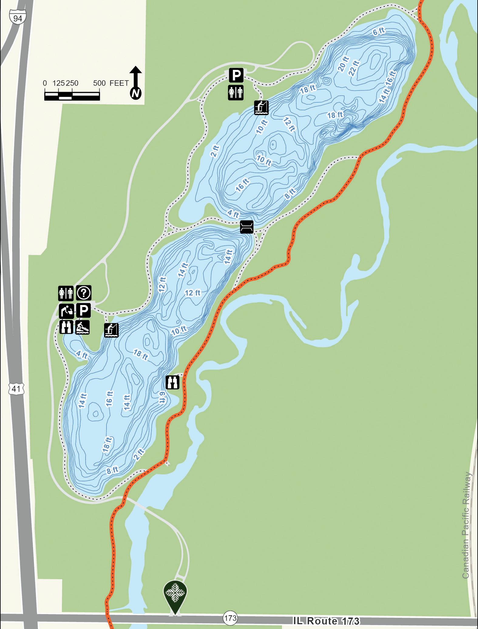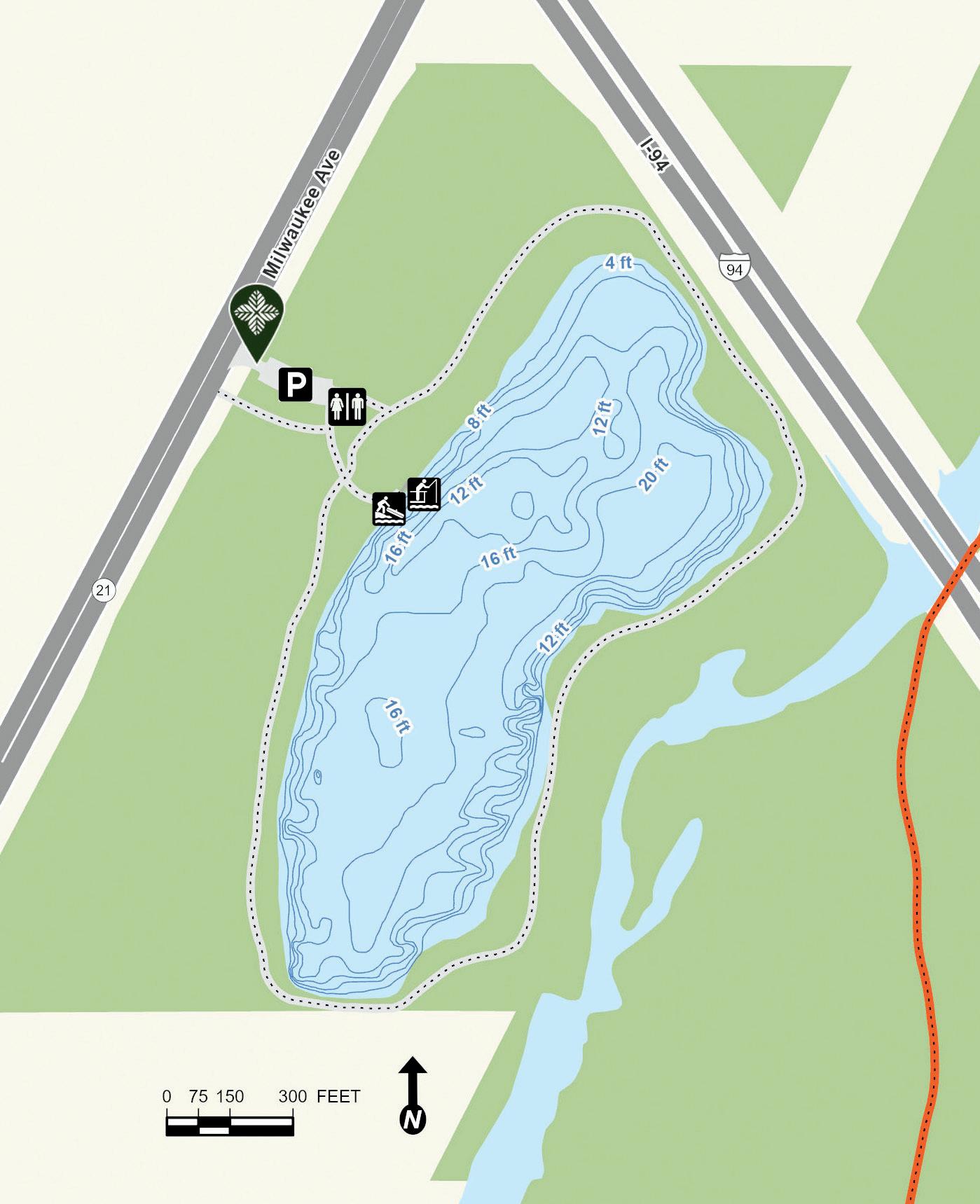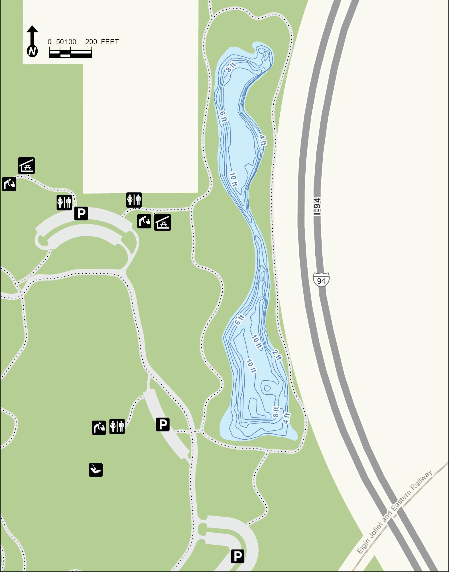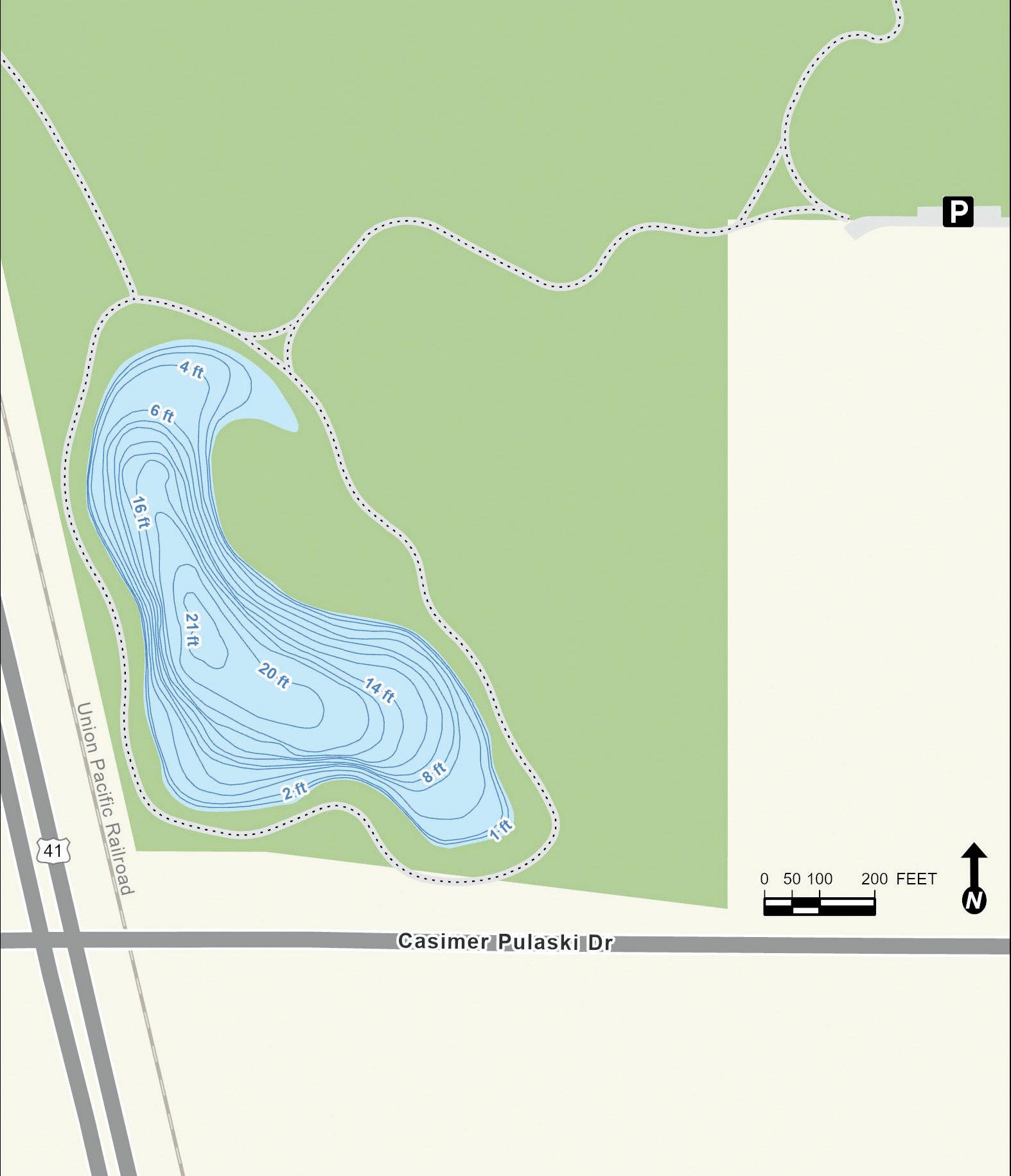 Old School Lake began as a borrow pit left over after construction of Interstate Tollway 94 in the 1950s. It was later expanded and reshaped into the form present today. Depth contours are estimates. Actual depths may vary.