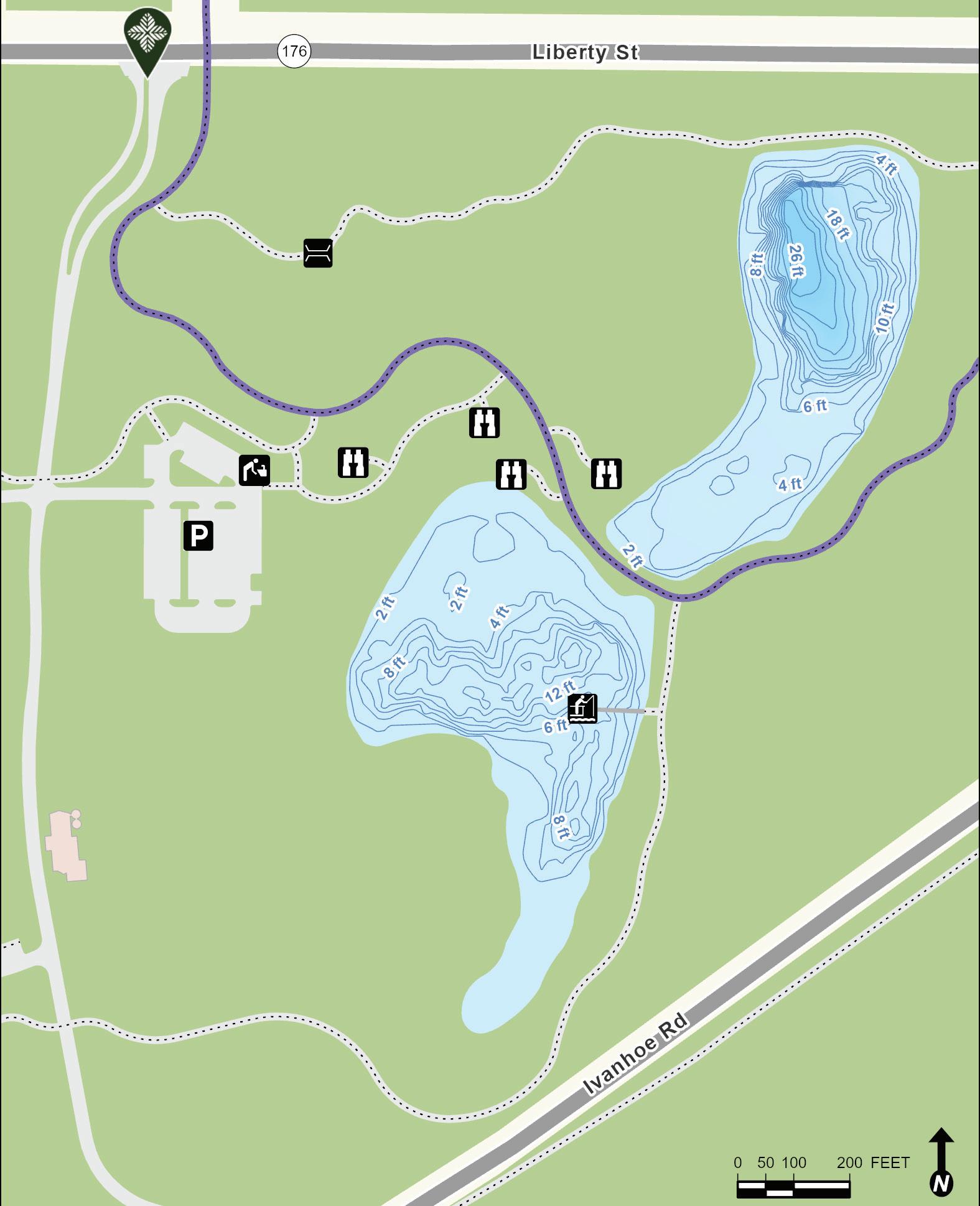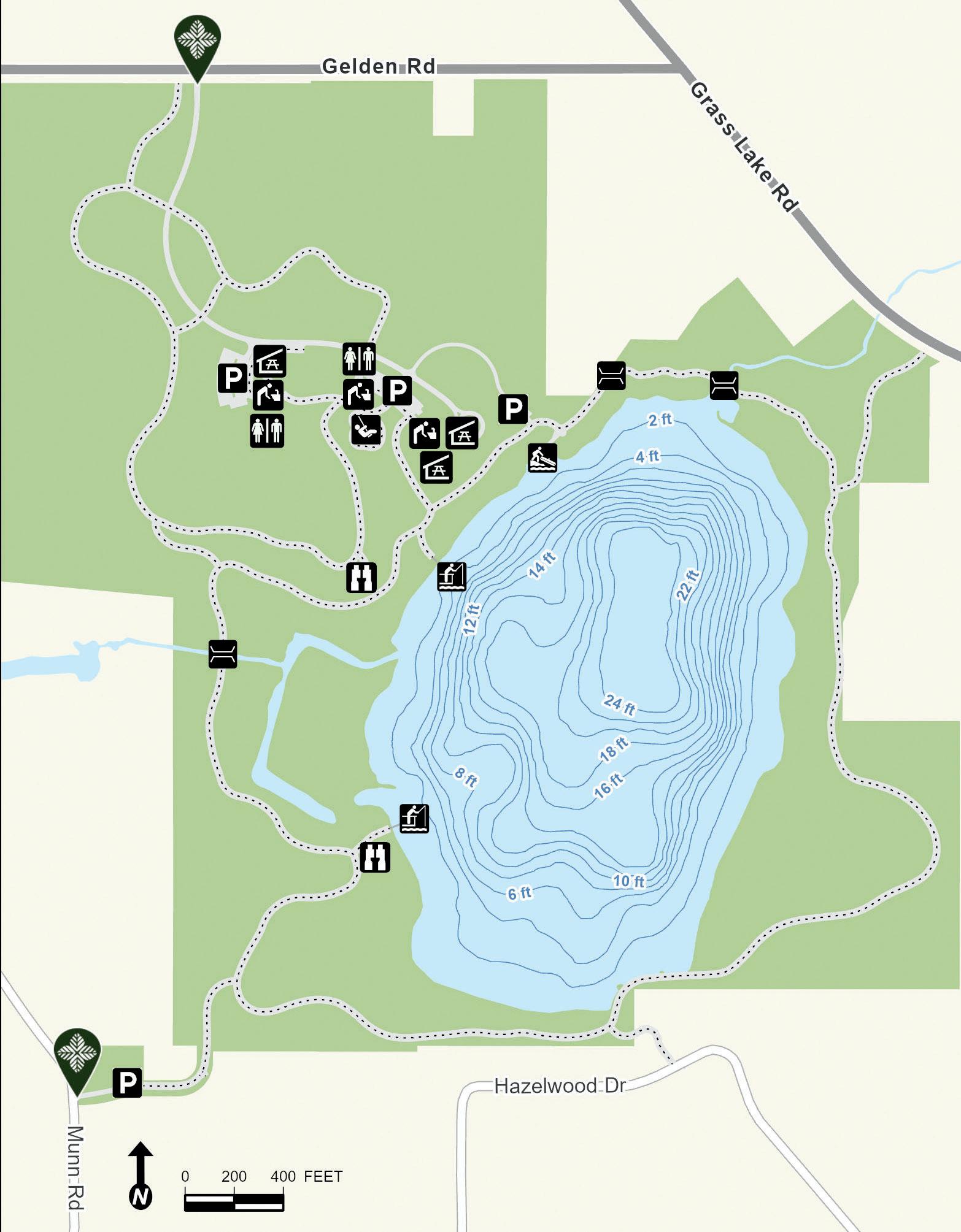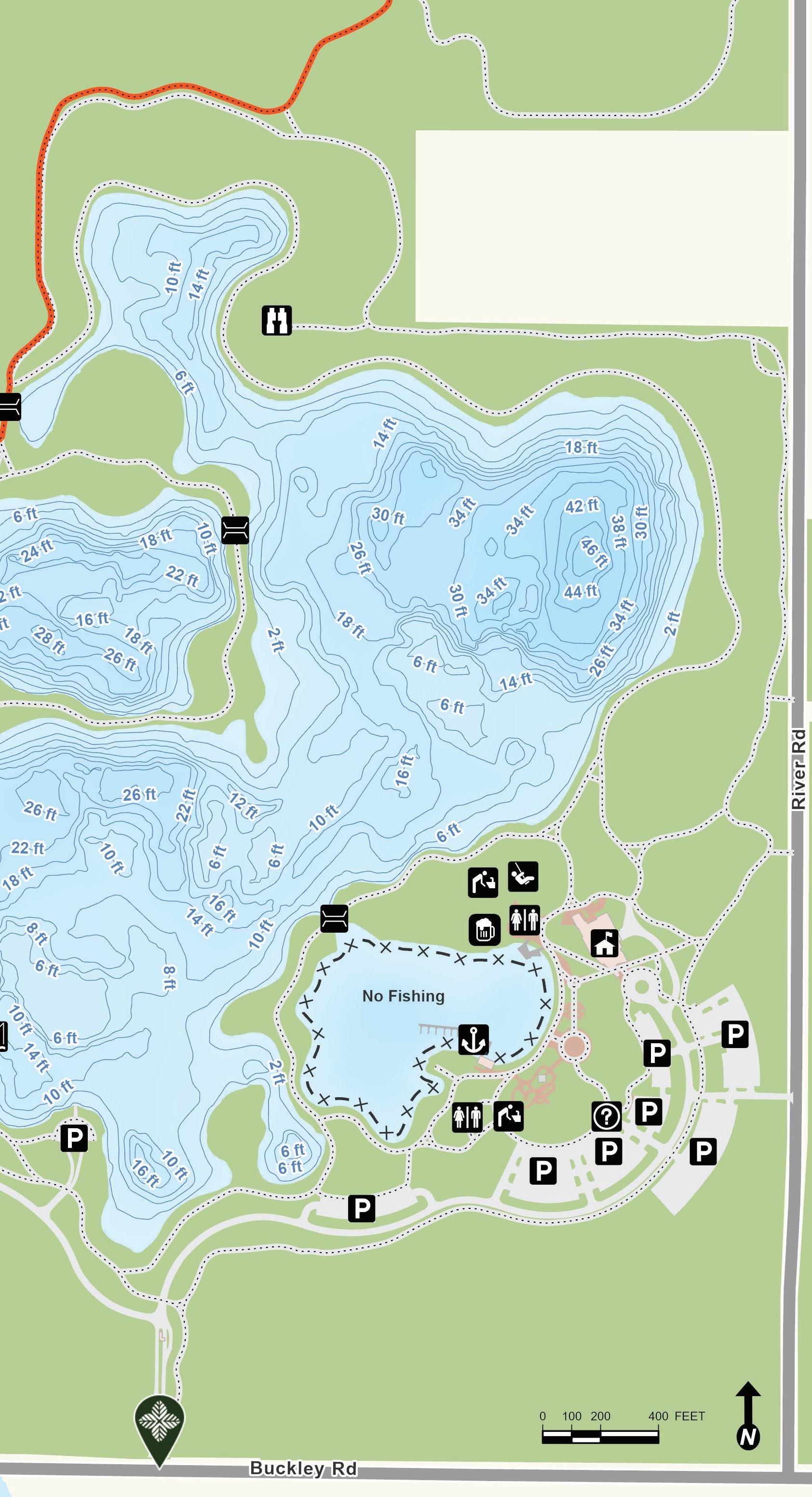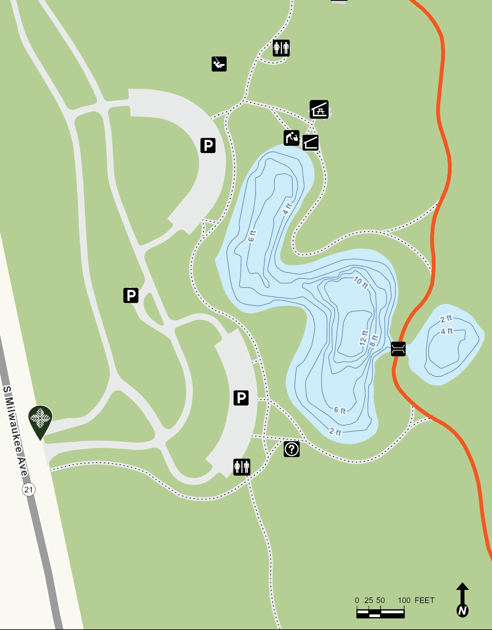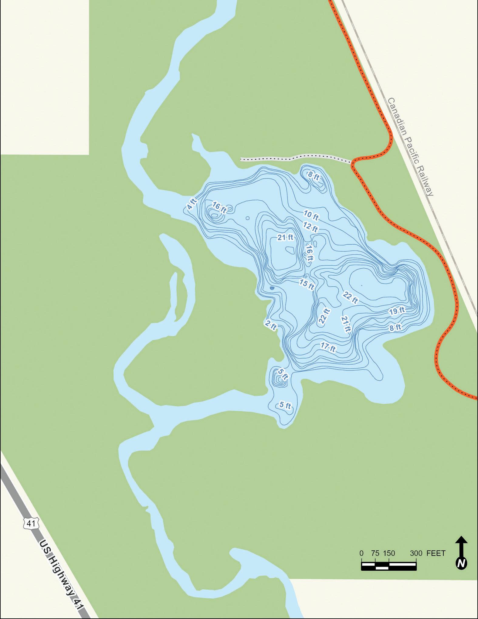 Old School Lake began as a borrow pit left over after construction of Interstate Tollway 94 in the 1950s. It was later expanded and reshaped into the form present today. Depth contours are estimates. Actual depths may vary.