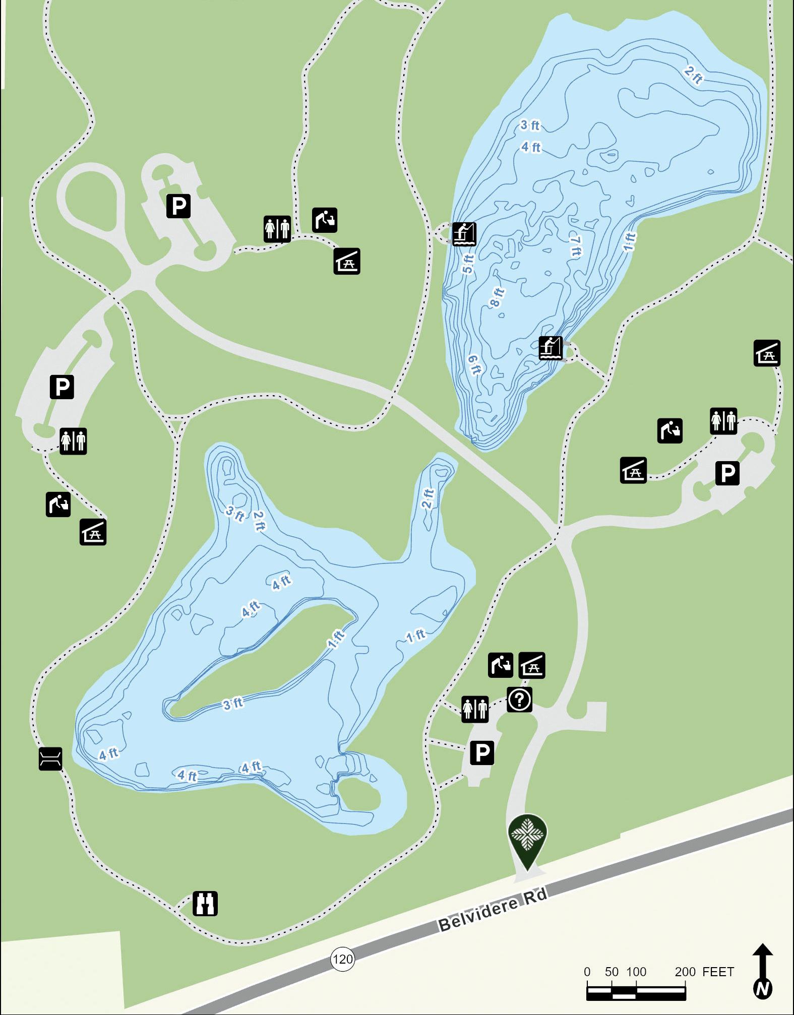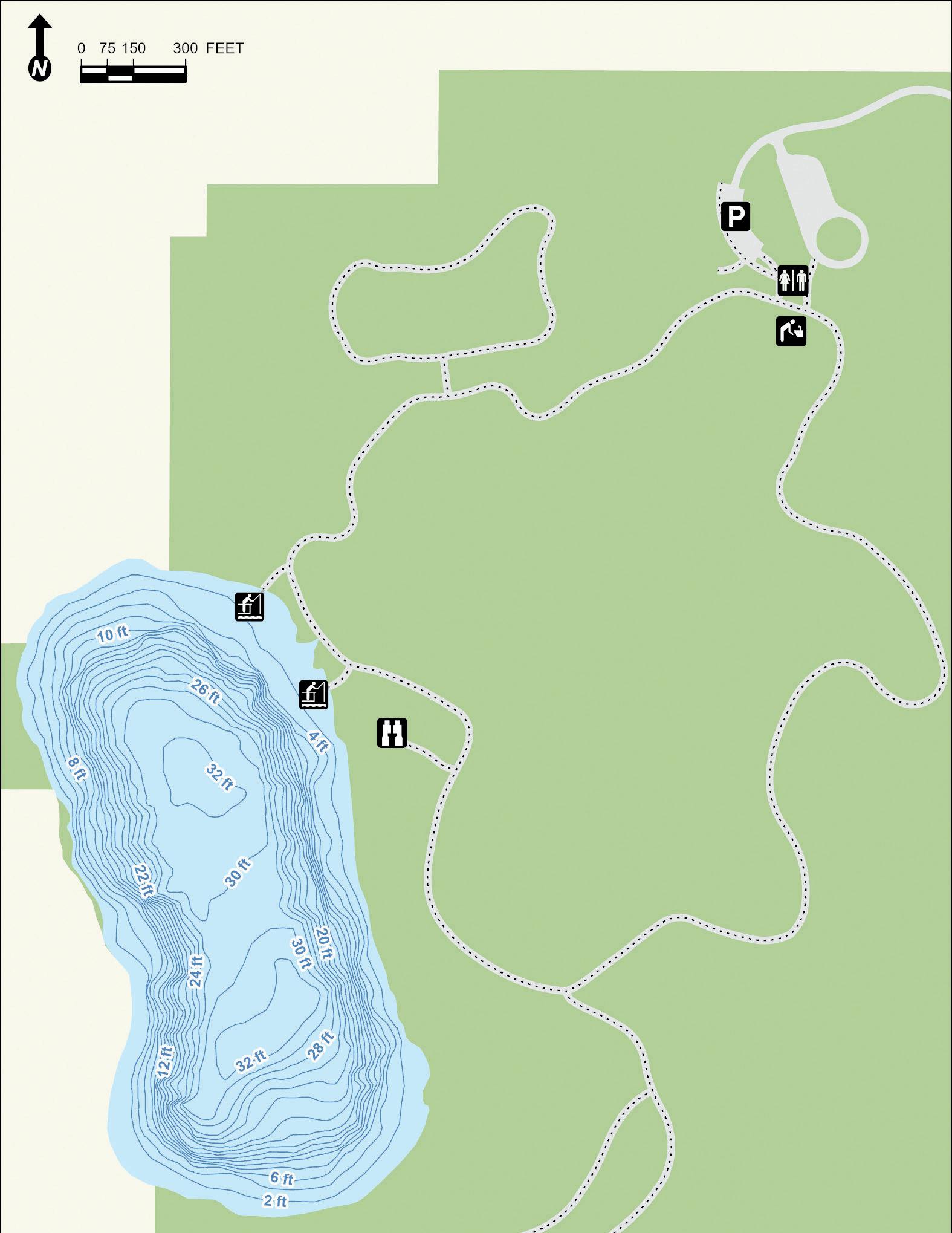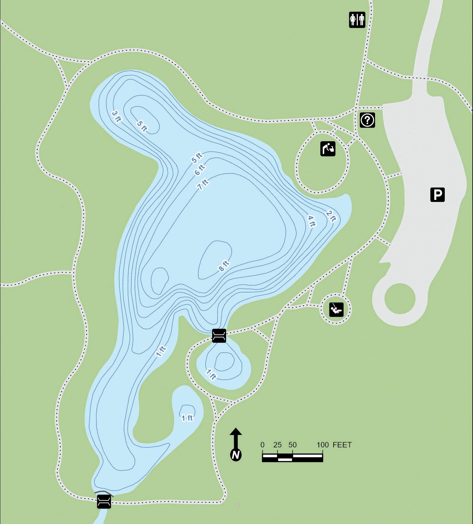 Hastings Lake features 7,800 feet of shoreline and many species for fishing. Parking and lake access for cartop boats, canoes, kayaks and other non-motorized watercraft are available. Two fishing piers are located on the western shore. Fishing nodes are on the southeastern shore. Depth contours are estimates. Actual depths may vary.
