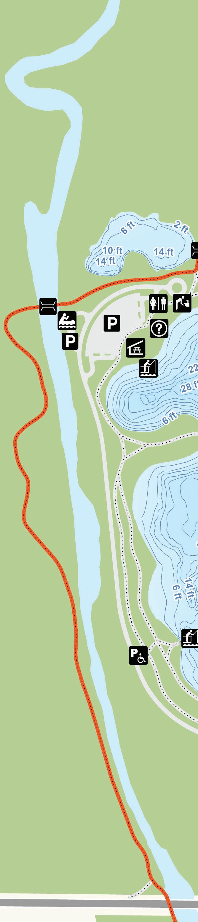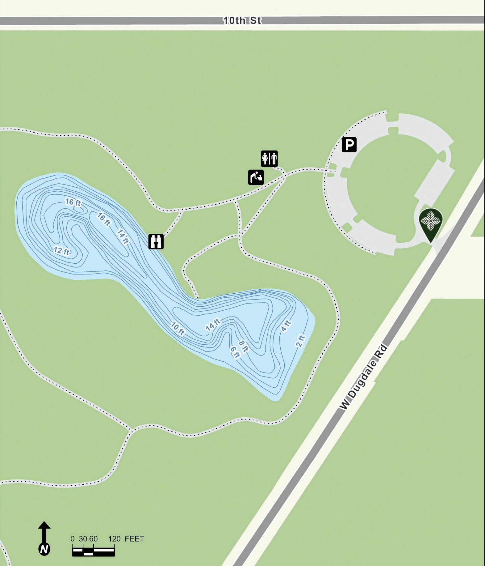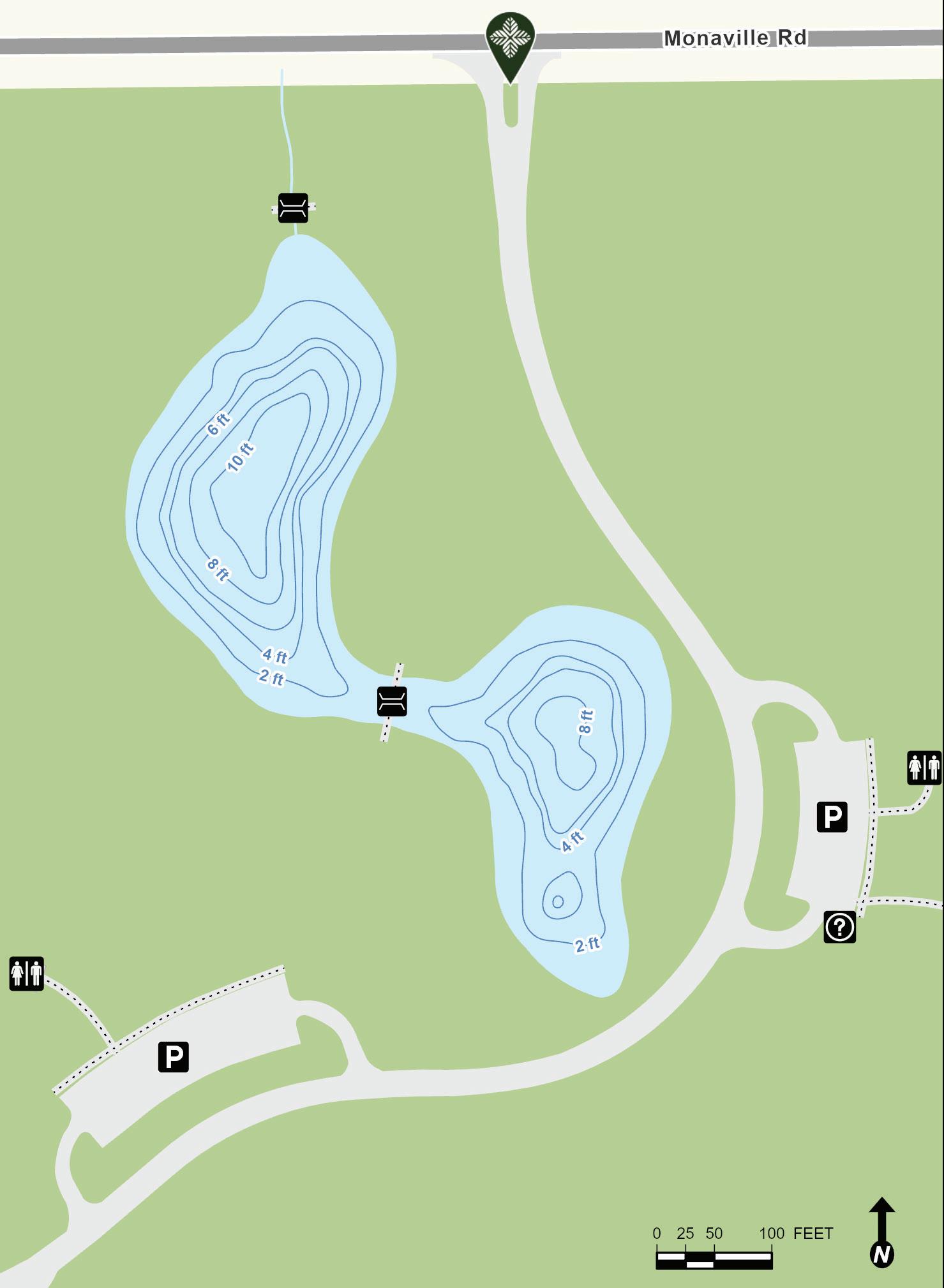Hastings Lake features 7,800 feet of shoreline and many species for fishing. Parking and lake access for cartop boats, canoes, kayaks and other non-motorized watercraft are available. Two fishing piers are located on the western shore. Fishing nodes are on the southeastern shore. Depth contours are estimates. Actual depths may vary.