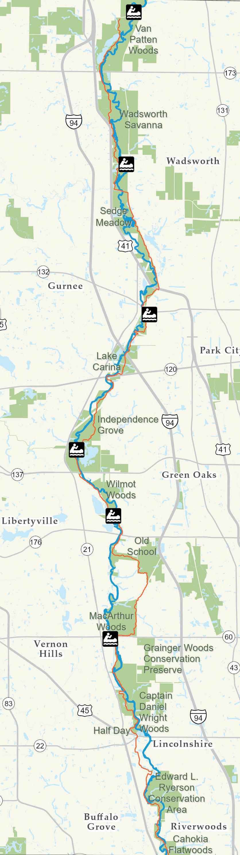 Originally an isolated sand and gravel pit, the Des Plaines River was rerouted through the Lake in 1987. Des Plaines Lake can be accessed from the Des Plaines River Trail with parking available at the Sedge Meadow main lot or Canoe Launch located south of Wadsworth Road.
