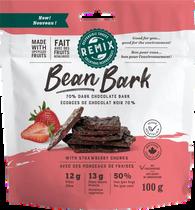 Nutritionist-formulated dark chocolate bark featuring upcycled fruits and black bean protein.