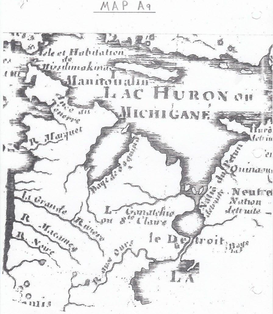 5. Map A9: 1730 Del’Isle Map showing fictitious channels and islands at the head of the St. Clair River.