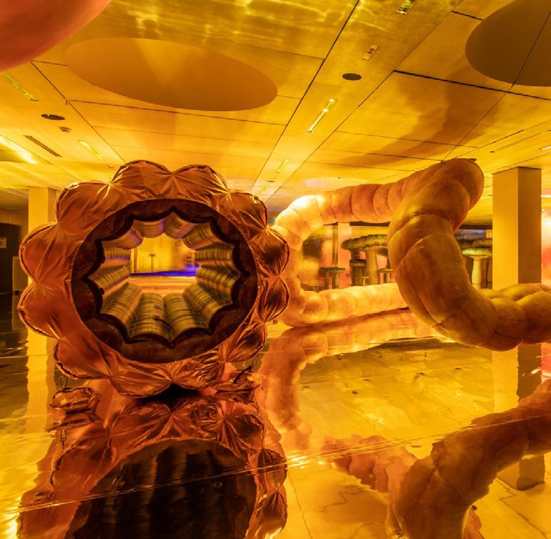 On découvre l’univers fantastique de Shiny Gold Bienvenue sur la planète ensoleillée de Nelly Ben Hayoun-Stépanian, dans un méli-mélo de jeux d’échelles où on se sent tantôt minuscule, tantôt gigantesque. Dans un univers rococo tout en doré, l’artiste française allie esthétique spectaculaire et sciences : champignons géants, organes XXL, calamar tentaculaire... Elle pointe notre microscopique position face à l’Univers et au Soleil.
