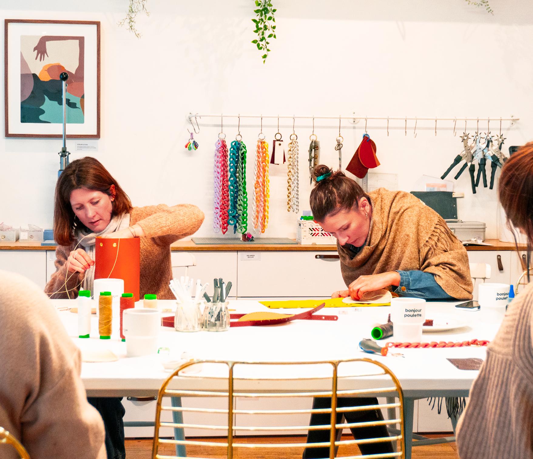 D’une durée de 2h30 à 4h, les ateliers se déroulent tous de la même manière, et on commence par l’étape la plus dure : le choix du modèle (une vingtaine de sacs à main, et des dizaines d’accessoires), ainsi que le choix des cuirs, parmi une infinité de couleurs. Des cuirs vibrants et de seconde main, récupérés