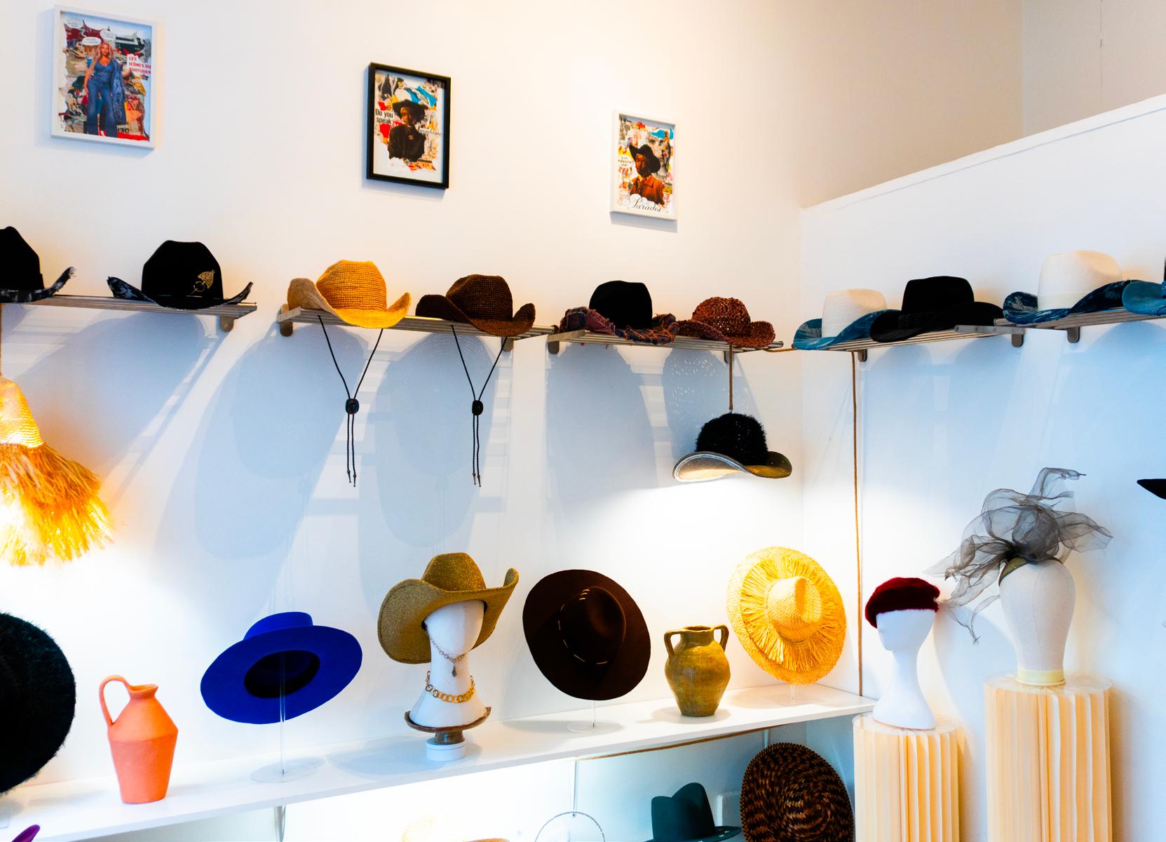 Des cow-boys, des bibis, des bérets, des casquettes, en mérinos, en feutre, en tissu recyclé ou en jean upcyclé… Les couvre-chefs sont soigneusement disposés, telles des œuvres d’art dans un musée.