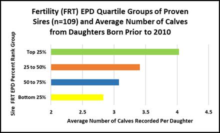 An internal evaluation of FRT EPD for proven sires indicated favorable associated average number of calves produced by daughters. The evaluation grouped 109 sires according to their FRT EPD percent rank quartile. It evaluated daughters born prior to 2010 so that all were old enough to express recorded progeny up to eight calf crops at 9 years of age.