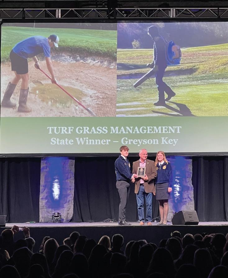 Congratulations to Greyson Key for being awarded State Winner in Turfgrass Management (sponsored by TTA) at the State FFA Convention!