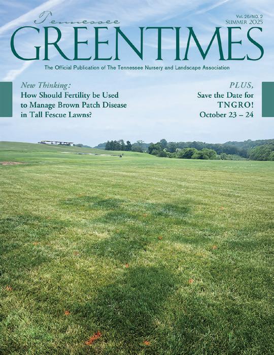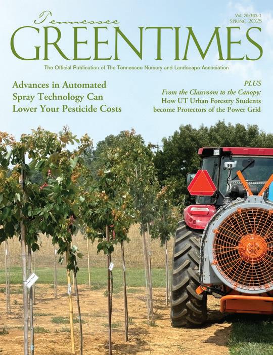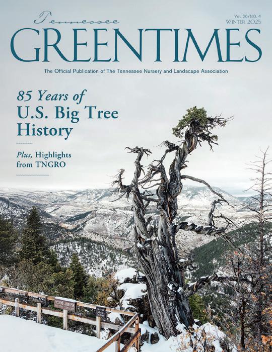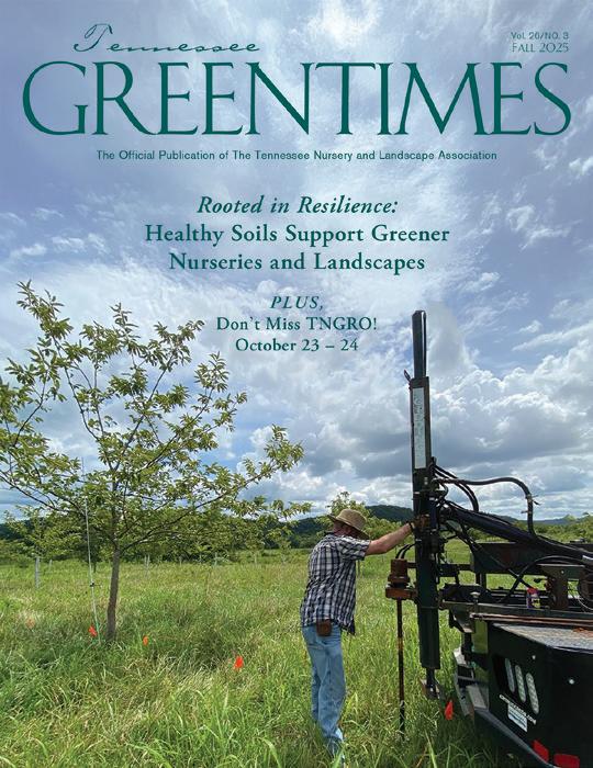 The Tennessee Nursery and Landscape Association serves its members in the industry through education, promotion and representation. The statements and opinions expressed herein are those of the individual authors and do not necessarily represent the views of the association, its staff, or its board of directors, Tennessee Greentimes, or its editors. Likewise, the appearance of advertisers, or their identification as Tennessee Nursery and Landscape Association members, does not constitute an endorsement of the products or services featured in this, past or subsequent issues of this quarterly publication. Copyright ©2026 by the Tennessee Nursery and Landscape Association. Tennessee Greentimes is published quarterly. Subscriptions are complimentary to members of the Tennessee Nursery and Landscape Association. Third-class postage is paid at Jefferson City, MO. Printed in the U.S.A. Reprints and Submissions: Tennessee Greentimes allows reprinting of material. Permission requests should be directed to the Tennessee Nursery and Landscape Association. We are not responsible for unsolicited freelance manuscripts and photographs. Contact the managing editor for contribution information. Advertising: For display and classified advertising rates and insertions, please contact Leading Edge Communications, LLC, 206 Bridge Street, Suite 200, Franklin, TN 37064, (615) 790-3718, Fax (615) 794-4524.