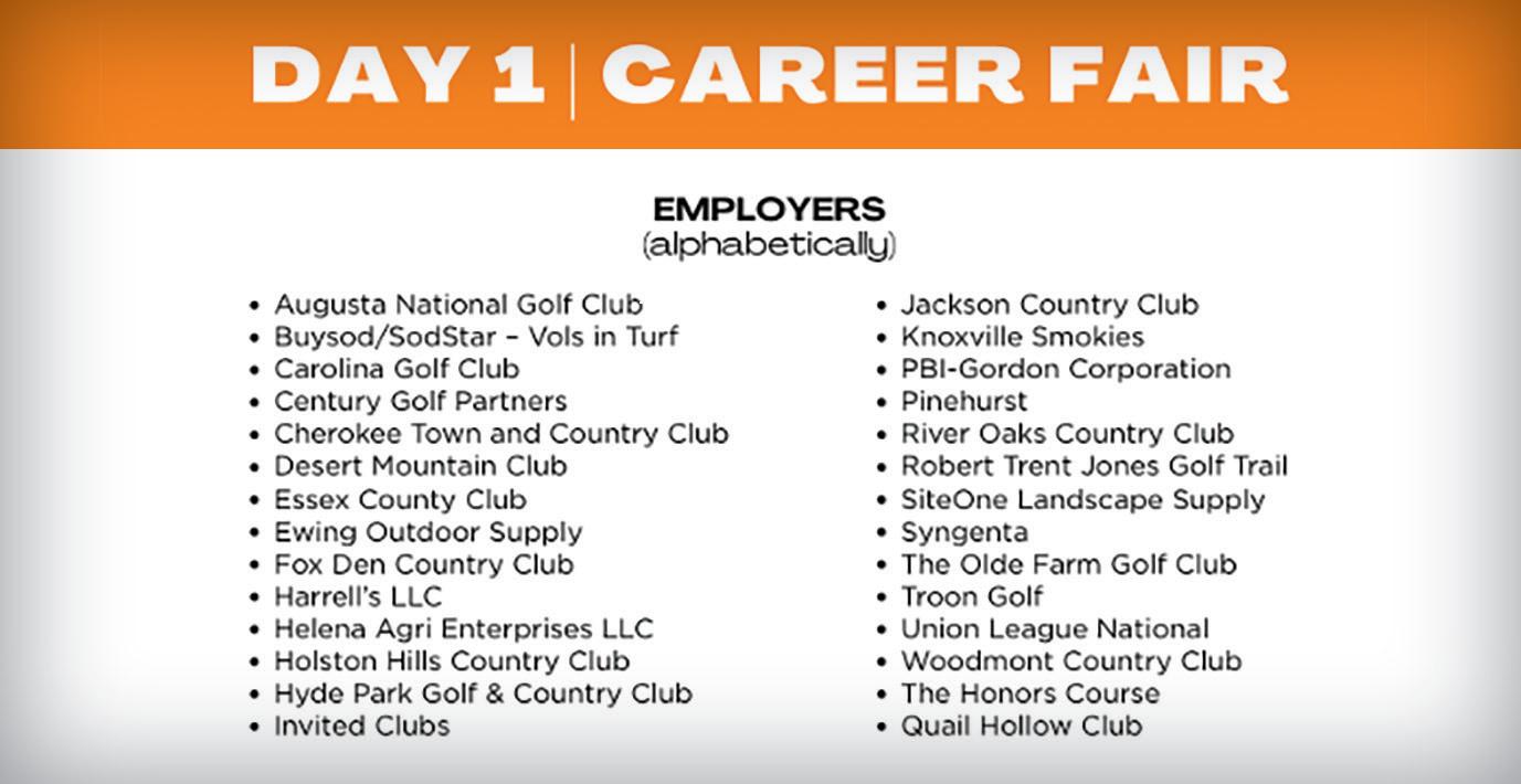 Day 1 of BEACON 25 centered on professional development and networking. We were grateful to welcome 28 employers, including the Knoxville Smokies, premier golf clubs such as Augusta National, Valhalla, Desert Mountain, Essex County Club, Quail Hollow, The Honors Course, and Pinehurst, along with major companies such as Harrell’s LLC, Helena Agri-Enterprises, Syngenta, SiteOne Landscape Supply, Ewing Outdoor Supply, and PBI-Gordon (Figure 2).
