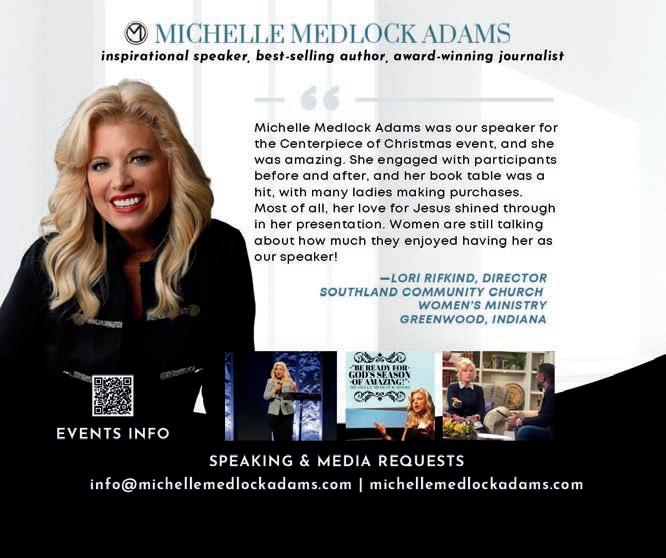 The words she read led her to do something she didn’t realize she needed—she repented. “I drove to the o ce crying out to God for answers. I knew the Bible contained every answer, but until that year, I had never read them for myself. I prayed, I’m sorry, Lord. I need you to give me the answer. I’ll do whatever you tell me to do!”