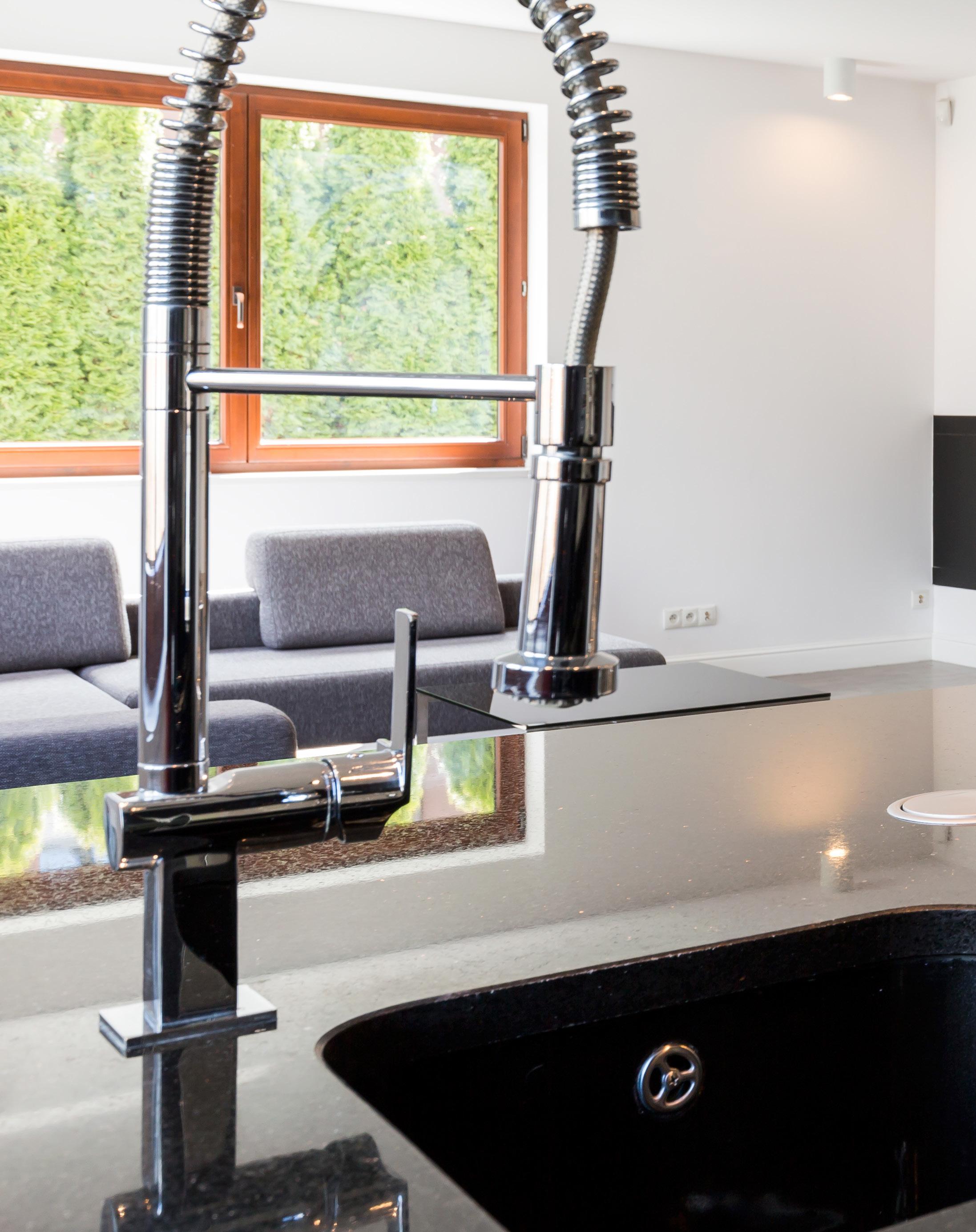 The best place to place the sink and the kitchen tap is in front of the window, if space permits. Opening or closing the window with a high spout tap ahead, is no longer a problem. .