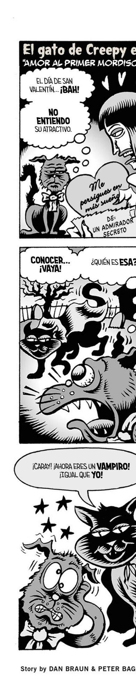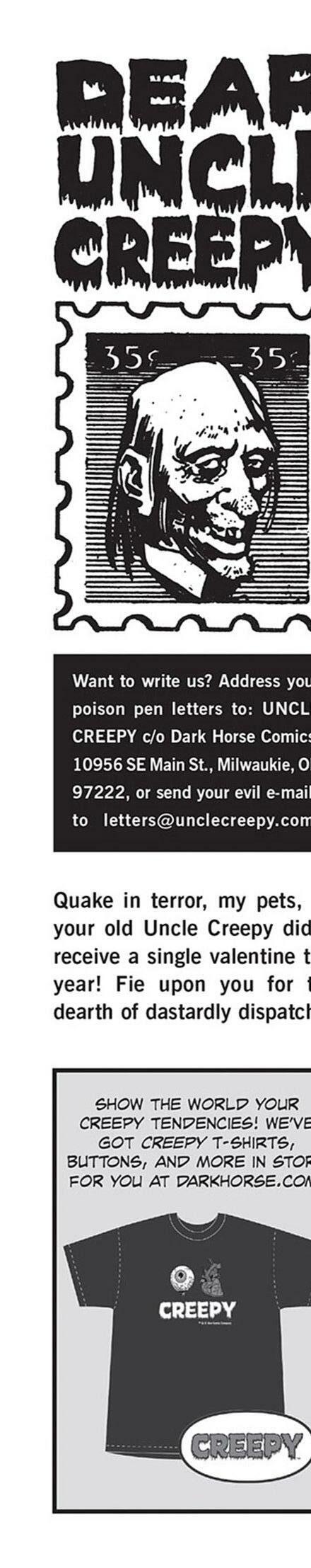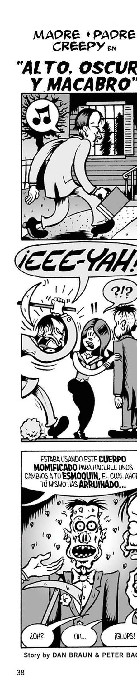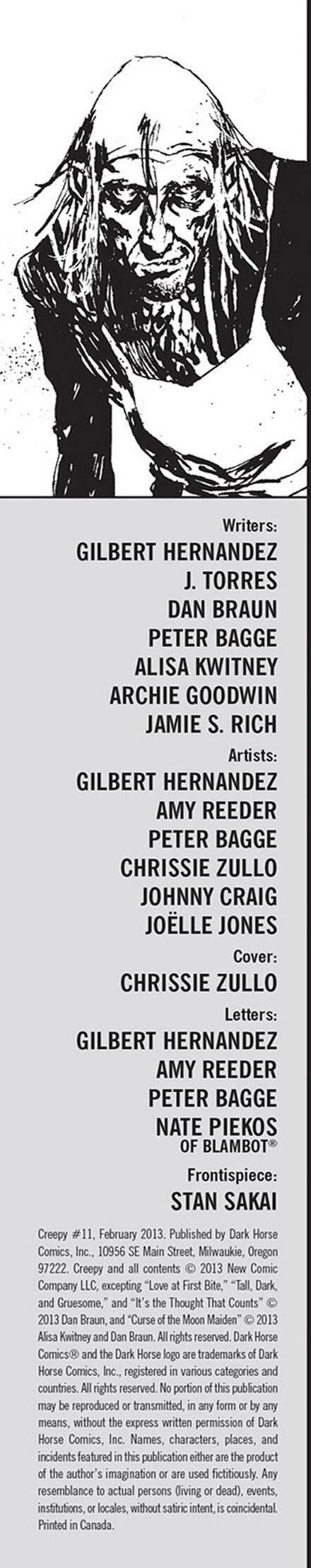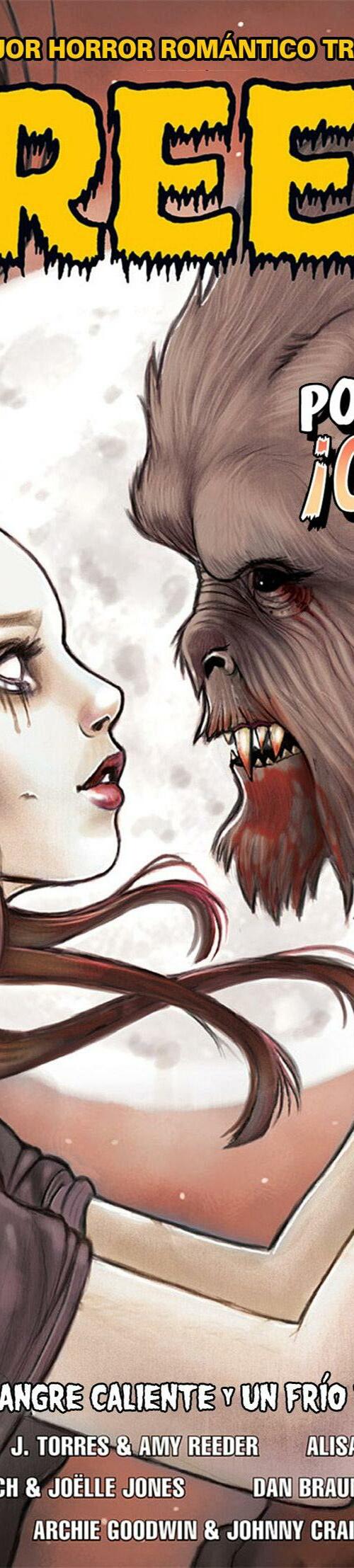 Prepárate para desmayarte con el ramo de terror que ofrece nuestro equipo: Gilbert Hernandez (Love and Rockets) teje una historia de amor que salió terriblemente mal, Jamie S. Rich (It Girl and the Atomics) y Joëlle Jones (Hourse of Night) brindan ¡un vistazo a los fantasmas voyeuristas, y J. Torres (Jinx) y Amy Reeder (Batwoman) hacen que tengas miedo de meterte en el agua o acercarte a tu amada! ¡Además, los Creepys encuentran el romance en las últimas tiras de Creepy Family de Dan Braun y Peter Bagge!
