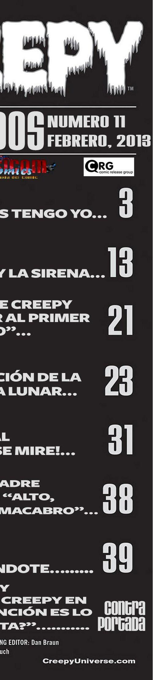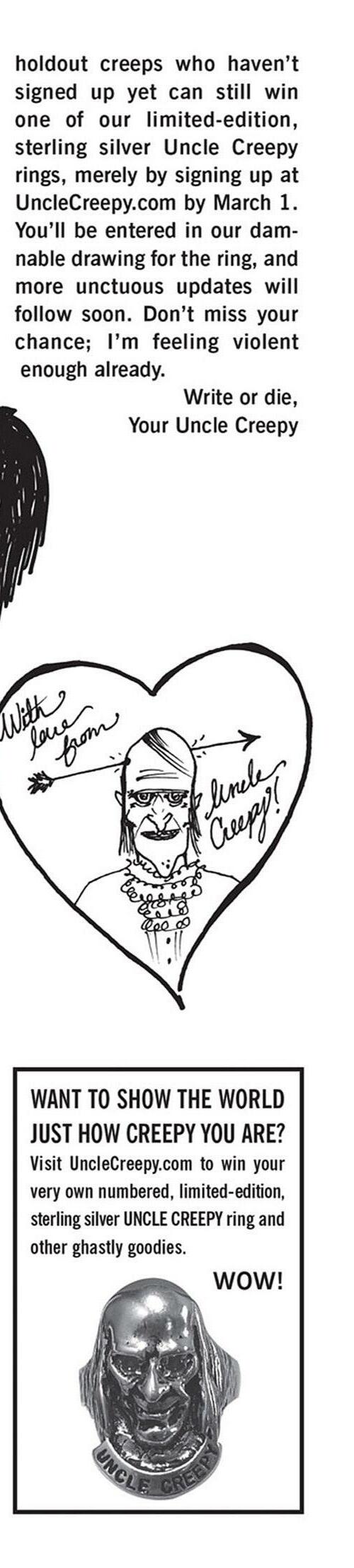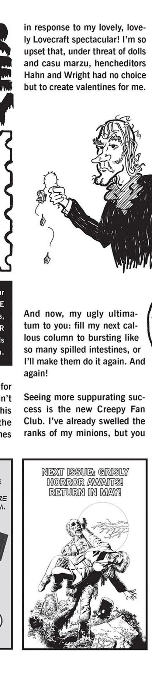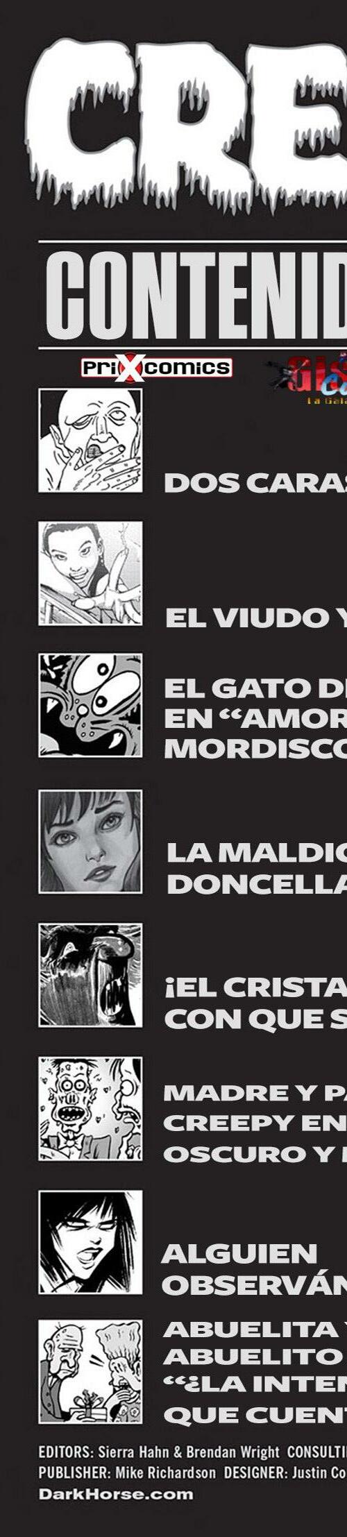 Prepárate para desmayarte con el ramo de terror que ofrece nuestro equipo: Gilbert Hernandez (Love and Rockets) teje una historia de amor que salió terriblemente mal, Jamie S. Rich (It Girl and the Atomics) y Joëlle Jones (Hourse of Night) brindan ¡un vistazo a los fantasmas voyeuristas, y J. Torres (Jinx) y Amy Reeder (Batwoman) hacen que tengas miedo de meterte en el agua o acercarte a tu amada! ¡Además, los Creepys encuentran el romance en las últimas tiras de Creepy Family de Dan Braun y Peter Bagge!