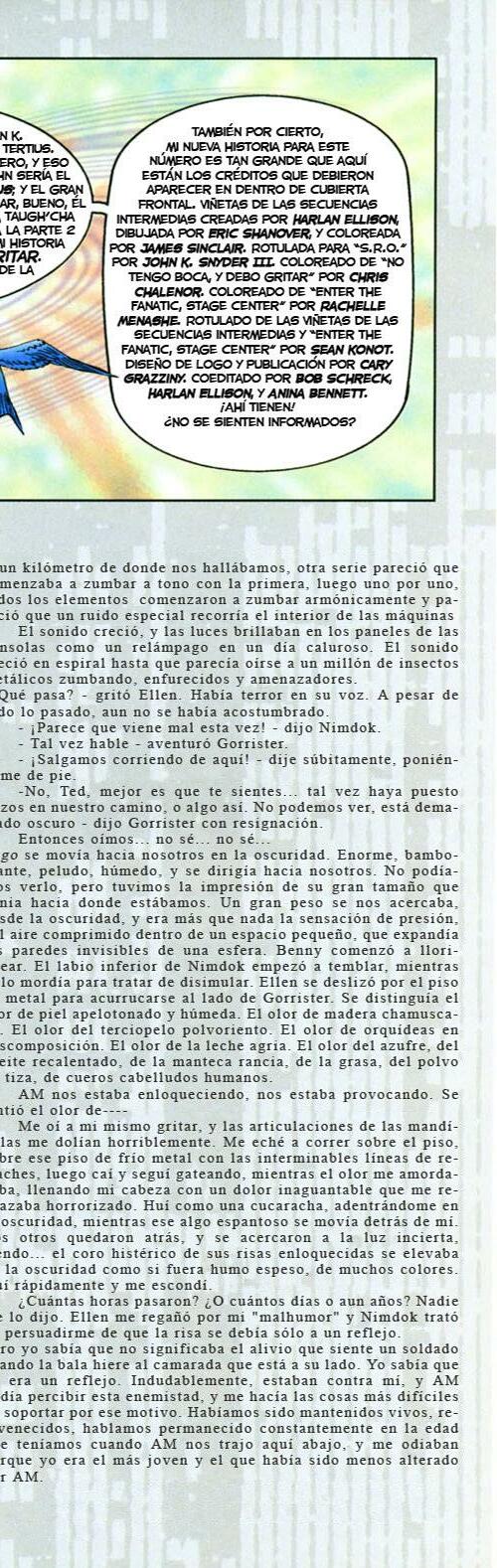 Los cinco humanos se ven condenados a una existencia horrible. AM los dota de vida inmortal, los alimenta con comida horrible, envía criaturas horribles para que los atormenten y evita con su poder que puedan suicidarse para dar fin al sufrimiento al que los somete.