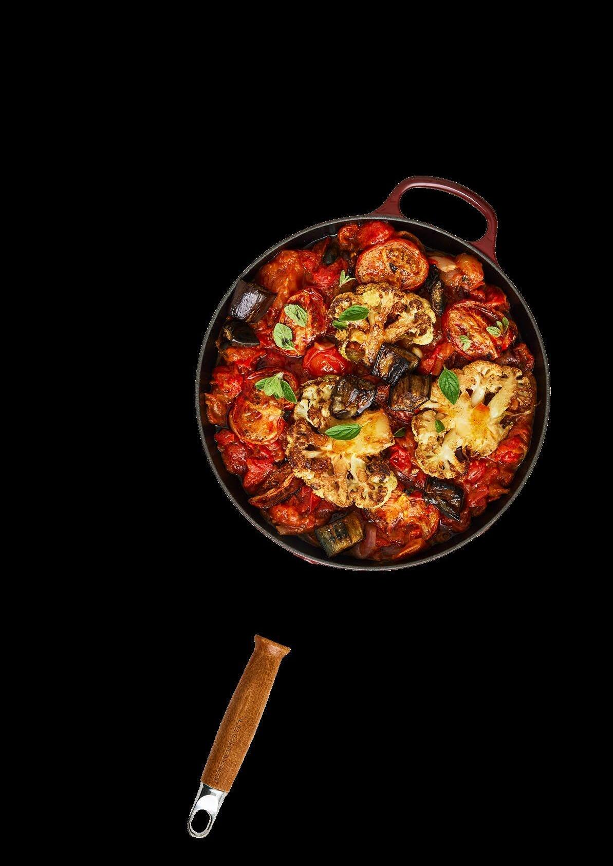 Olivenöl in einer Le Creuset Signature Bratpfanne (28 cm) bei mittlerer Hitze auf dem Herd erwärmen. Die Auberginenstücke darin von allen Seiten goldbraun anbraten, würzen, aus der Pfanne nehmen und beiseitestellen. Nun den Blumenkohl darin in etwas mehr Olivenöl braun anbraten, würzen und ebenfalls beiseitestellen.