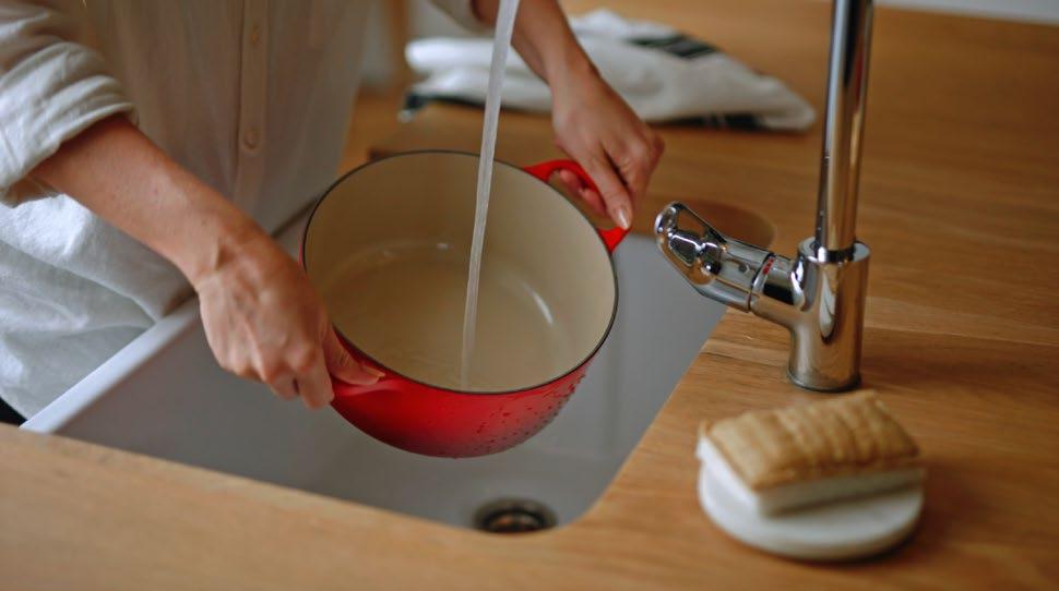 Wichtig ist zudem, das Kochgeschirr vor dem Spülen stets gut abkühlen zu lassen. Wenn Sie noch warmes Gusseisenkochgeschirr mit kaltem Wasser befüllen oder in kaltes Wasser stellen, kann die Emaillierung brüchig werden.