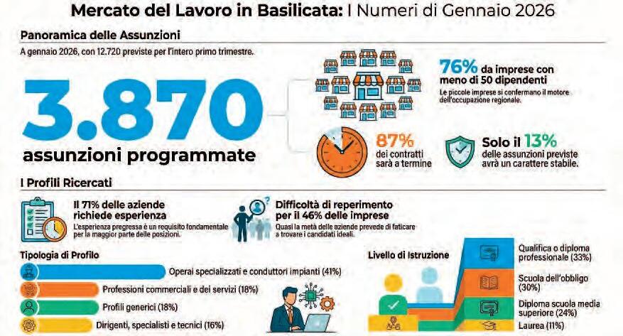Ilmercato del lavoro in Basilicata apre il 2026 con segnali di dinamismo concentrati in alcuni settori, ma continua a fare i conti con problemi strutturali legati alla precarietà dei contratti e alla difficoltà di reperire profili qualificati. È quanto emerge dal nuovo bollettino mensile di Excelsior Informa, il Sistema Informativo realizzato da Unioncamere in collaborazione con il Ministero del Lavoro e delle Politiche Sociali.Secondo le ultime rilevazioni, per il solo mese di gennaio 2026 le imprese lucane hanno programmato circa 3.870 nuove assunzioni. Allargando l’orizzonte temporale al primo trimestre dell’anno (gennaio-marzo 2026), il numero complessivo delle entrate previste sale a 12.720 unità.Il mercato del lavoro regionale resta tuttavia fortemente orientato verso rapporti a durata pre-
