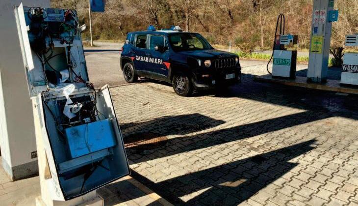 Scardinano il totem della stazione di servizio e poi vengono messi in fuga dai Carabinieri: recuperata la cassa e sequestrati attrezzi