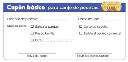 Cupones para canje de pesetas: estos son los papeles que llenas para usar tus pesetas canjeándolas por los premios que acordaste con tu Tutor. Hay dos tipos de cupones: los cupones básicos y los cupones especiales.