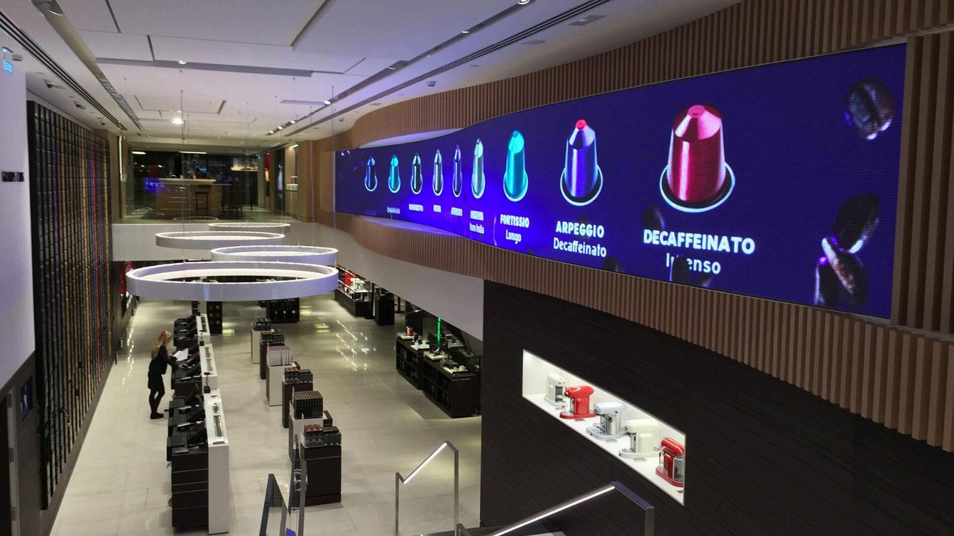 Diseño e instalación de la pantalla LED curva flexible dentro de la Megastore, cuya singularidad radica en su formato circular de 360 grados