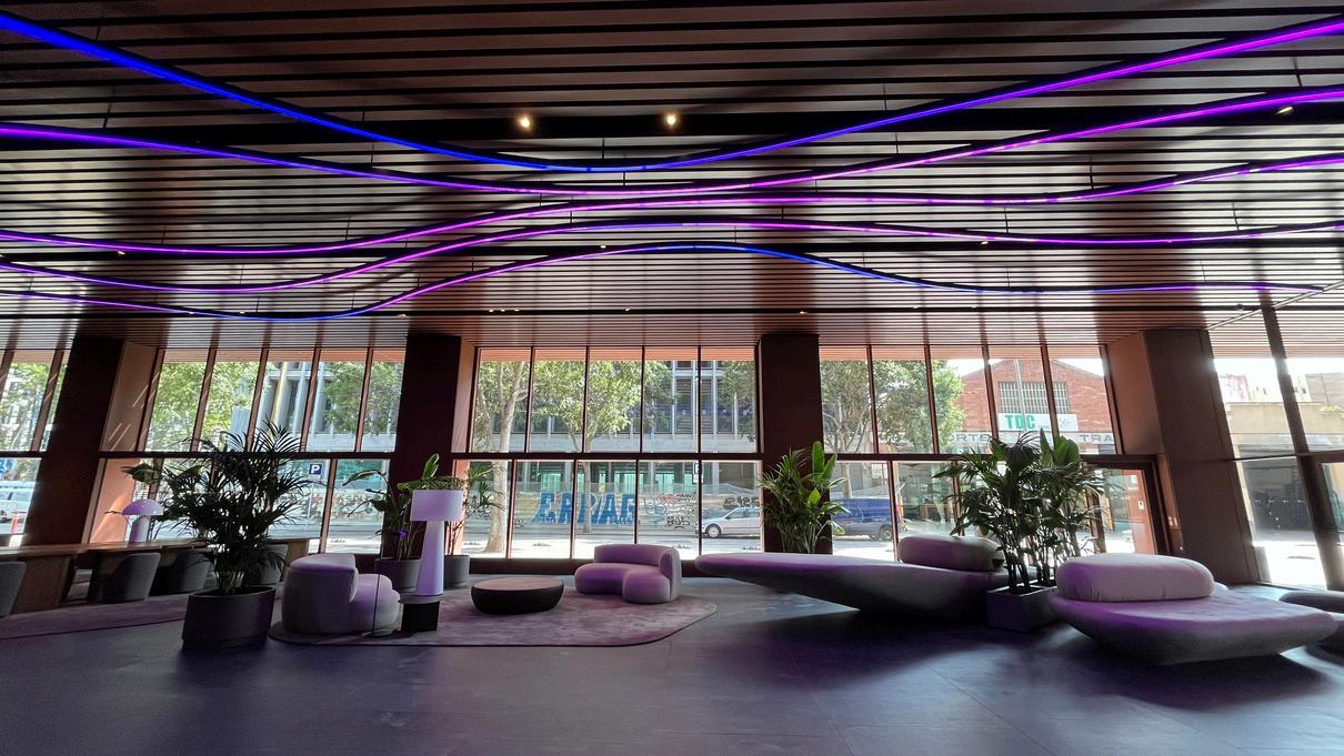 Se trata de una marquesina digital de 80 m² integrada en el techo del acceso principal, que funciona como un lienzo dinámico y cromático. Más que una innovación tecnológica, es un elemento clave del diseño arquitectónico del hotel, que adapta su iluminación en tiempo real para crear una atmósfera inmersiva y única.