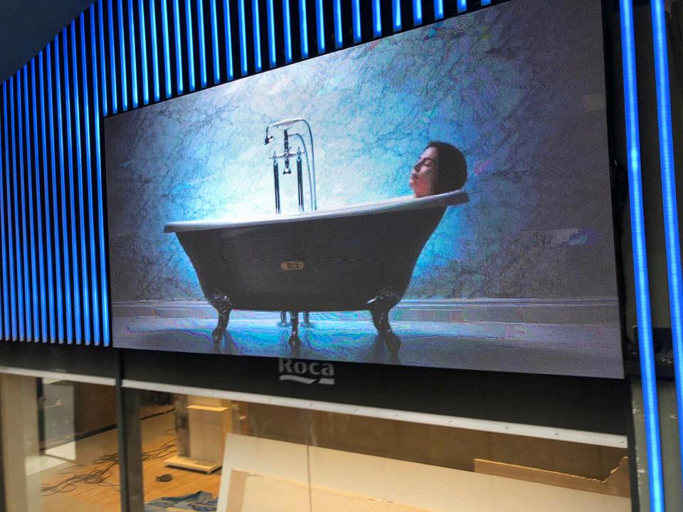 digital de la fachada en el que se ha instalado un sistema de iluminación LED digital en forma de lineales verticales, un total de 120 unidades con casi 3m de longitud cada uno y alberga en su diseño interior una pantalla LED exterior de alta resolución de 3x1,5 metros (pixel 3.91mm Gold Wire) que permite mostrar los nuevos productos e invita a ingresar a los transeúntes.