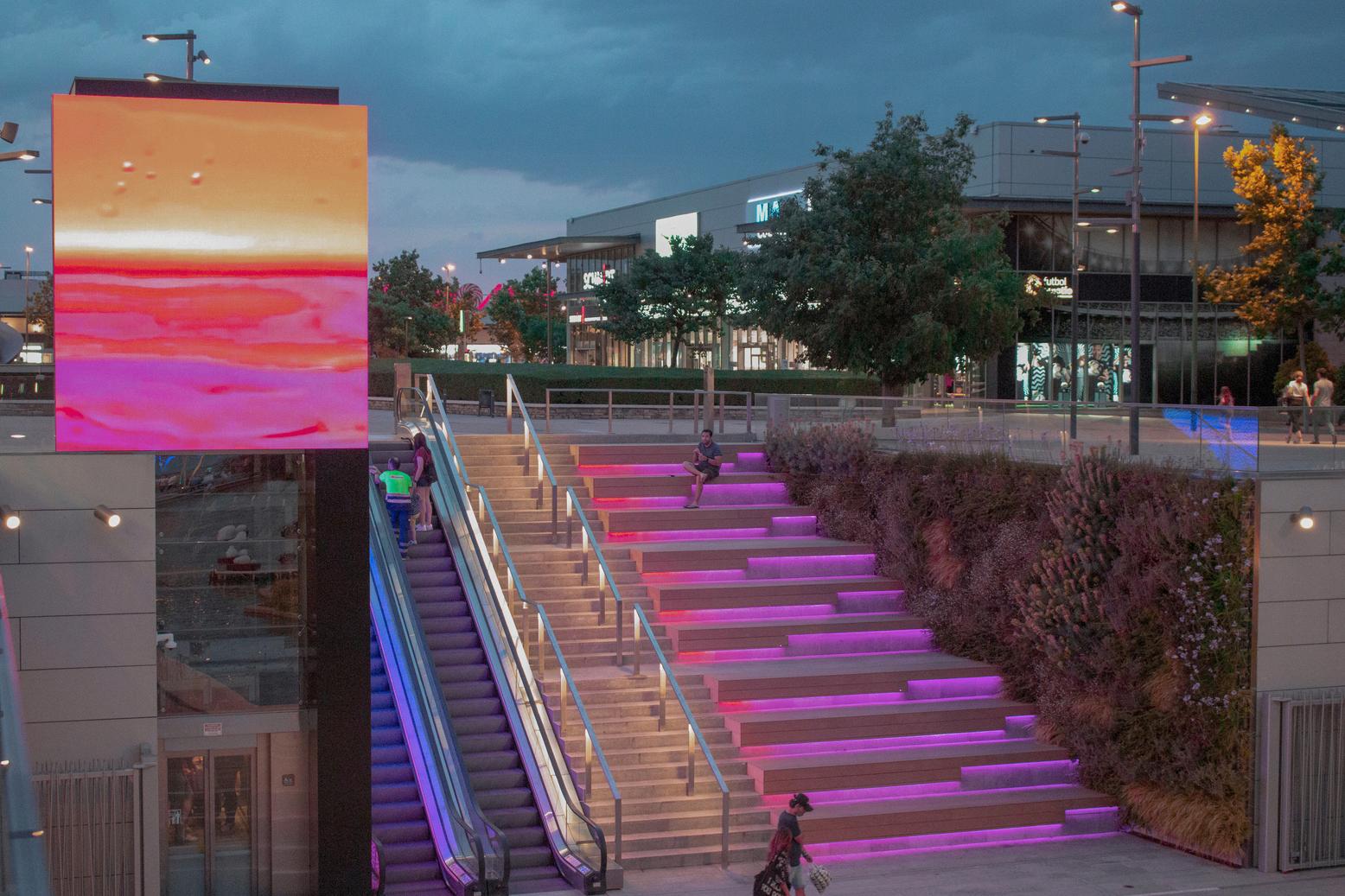 Innovador concepto tecnológico que fusiona tecnología y arquitectura. Un gran abanico de hardware de vídeo con iluminación digital dinámica, contenidos visuales ad-hoc en tiempo real, contenidos 2D y en 3D, anamórfico Creamos una experiencia única e inmersiva en una de las entradas principales del centro comercial.