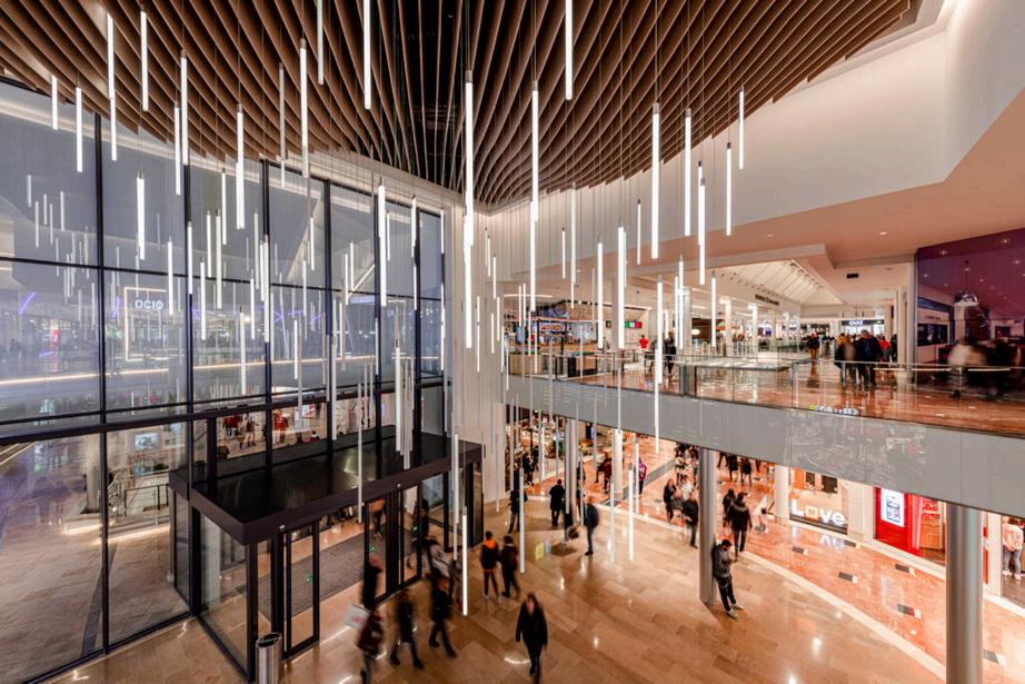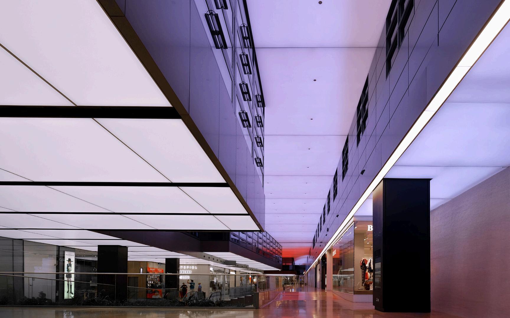 V-Lit ubicadas en el atrio principal del centro comercial “Tres Aguas“ de Madrid Las luminarias V-lit cuentan con superficie doble de difusión para ocultar el punto de luz y una alta resolución para poder realizar movimientos de iluminación suaves y fluidos.