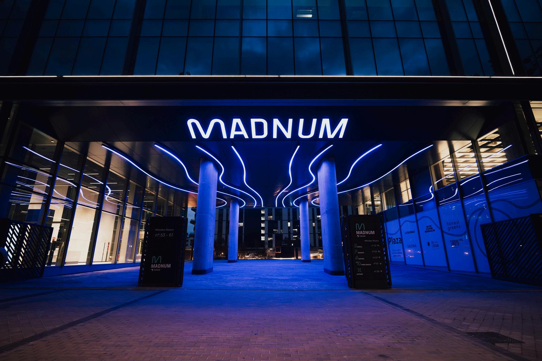 La iluminación digital, diseñada especialmente para el cliente, convierte el acceso a Madnum en una experiencia inmersiva que guía al visitante desde la entrada principal hasta La Plaza de Madnum, un espacio central abierto y ajardinado que conecta de forma natural los distintos ambientes del complejo